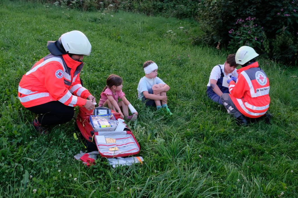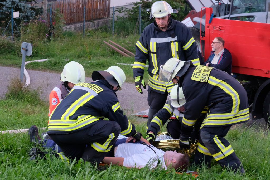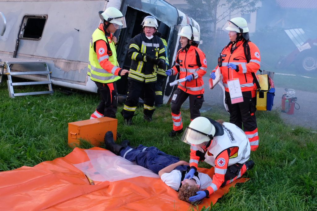 Nach rund einer Stunde waren alle Verletzten geborgen. Die leichter Verletzten, die selbst gehen konnten, wurden aus der Gefahrenzone weggeführt, während den „Schwerverletzten“ in einem Sicherheitsabstand vom Bus auf einer großen Plane direkt vor Ort erste Hilfe zuteil wurde.