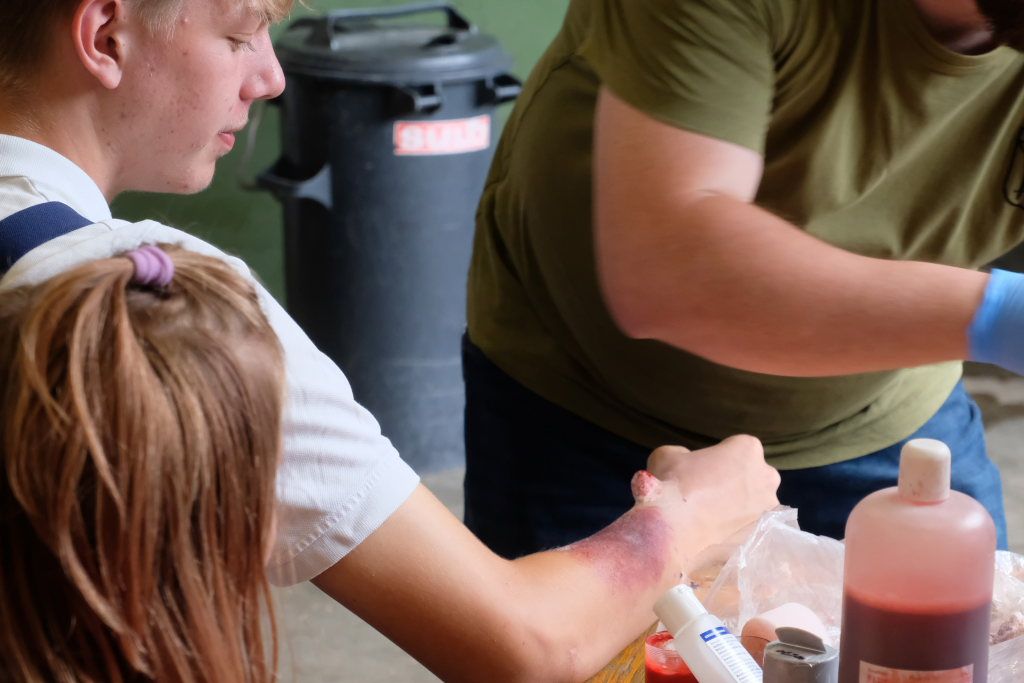 Nun also war an diesem Donnerstagabend alles vorbereitet: Die Mitglieder der Jugendfeuerwehr und des Jugendrotkreuzes waren von den Spezialisten des DRK-Ortsverbandes – beinahe über-lebensecht – als Verletzte geschminkt, Rolf Butscher hatte den Bus mittels Wasserdampf in eine dichte „Rauchwolke“ eingehüllt, als die ersten Rettungskräfte des DRK, die im Falle eines Unfalles immer zuerst alarmiert werden, eintrafen und sich ein erstes Bild von der Lage verschafften. Da der Bus (gesichert von einem Bagger) auf der Seite lag, konnten die Verletzten nur durch die Dachluken und – nach dem Aufsägen der Frontscheibe durch die inzwischen eingetroffenen Feuerwehrleute – durch das entstandene Loch geborgen werden.