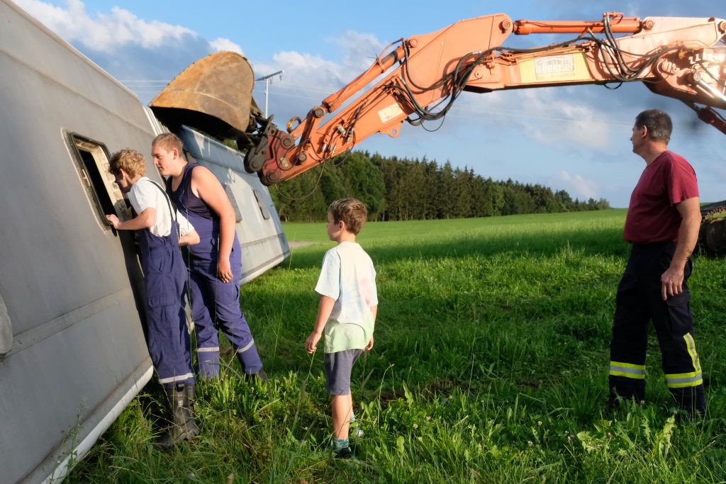 Mit vor Ort waren auch die meisten Mitglieder der Altersabteilung der Bad Wurzacher Wehr, die konzentriert das Spektakel verfolgten und bei der Analyse ihren Nachfolgern einige Hinweise geben konnten. Ebenfalls vor Ort war die Familie des Busunternehmens, dessen ehemaliges Fahrzeug sich nun vor ihren Augen in seine Bestandteile auflöste.