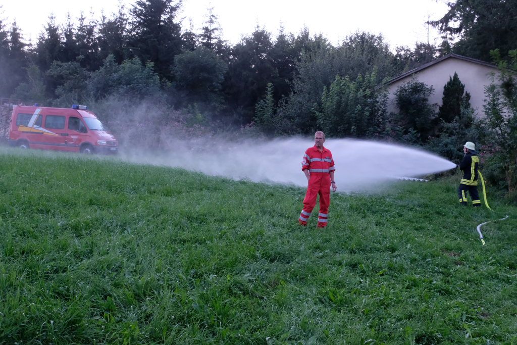 Nach und nach trafen dann immer mehr Fahrzeuge von DRK und Feuerwehr ein, am Schluss zählte die Einsatzleitung der Feuerwehr 37 Feuerwehrleute der Abteilung Stadt sowie sechs Kameraden der Ziegelbacher Wehr, die mit ihrem neuen, jetzt wasserführenden Fahrzeug für das „Löschen“ und Kühlen des Motorbrandes zuständig waren. Das DRK war mit insgesamt fünf Fahrzeugen und 20 Helfern, darunter einem Notarzt, vor Ort.
