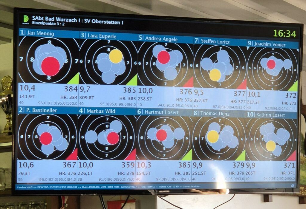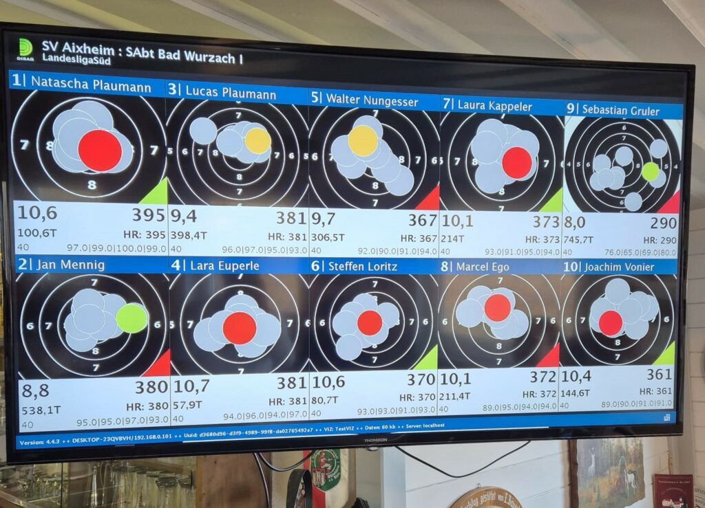 Die zum Kreis Tuttlingen gehörenden Schützen lieferten dem Gastgeber einen äußerst spannenden Wettkampf. Jan Mennig (380:395) musste sich klar geschlagen geben. Nach 381:381 Ringen musste Lara Euperle ins fünfmalige Stechen, bei 9,5 : 9,4,/10,4 : 10,0/9,9 : 9,0/9,2 : 9,2/ verdiente sie den schwer erkämpfen Zähler mit 9,5 : 9,0 um fünf Zehntel. Mit knappen drei Ringen behielt Steffen Loritz (370:367) die Oberhand. Gegen den Aixheimer Ersatzschützen hatte Joachim Vonier (361:290 ) ein leichtes Duell erwischt.