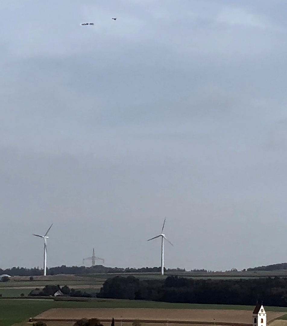 Das unten eingefügte Foto vom Bannerflug am 5. Oktober machte Wolfgang Hübner von einem Standort oberhalb des Maxhofes aus (an der Straße nach Wengenreute). Das Flugzeug fliegt in einer Höhe von 285 Meter über Riedniveau. Im Hintergrund sieht man den Haidgauer Berg. Der Höhenzug würde von den bei Osterhofen geplanten Windkraftanlagen um bis 180 Meter überragt. Bitte auf das Bild klicken: Dann stellt es sich vergrößert dar.