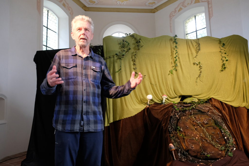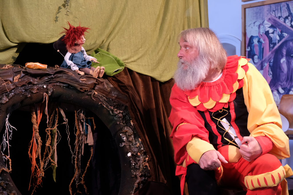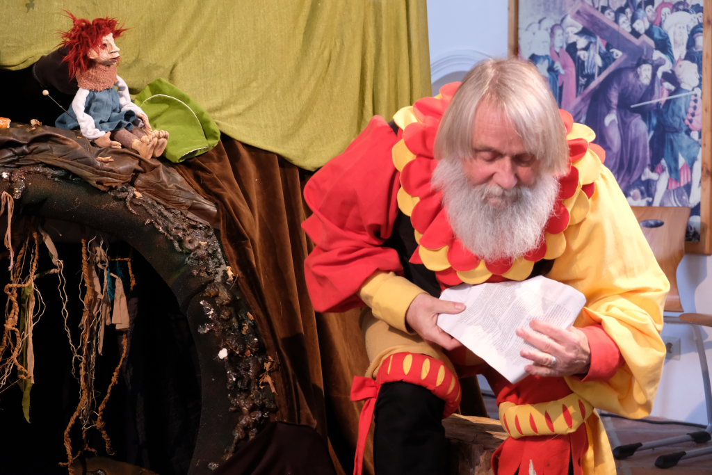 Bad Wurzach – Die Aufführung fand im Leprosenhaus statt: Mooria, das kleine, aber liebe und furchbar neugierige Fabelwesen (gesprochen von Angelika Jedelhauser) trifft nach der Begrüßung der Gäste durch Bernhard Maier, dem Vorsitzenden des Leprosenhaus-Fördervereines, bei der Aufführung in der Leprosenhaus-Kapelle auf den Landsknecht Kunz (Michael Skuppin), für den für 500 Jahre die Zeit stehen geblieben war.
