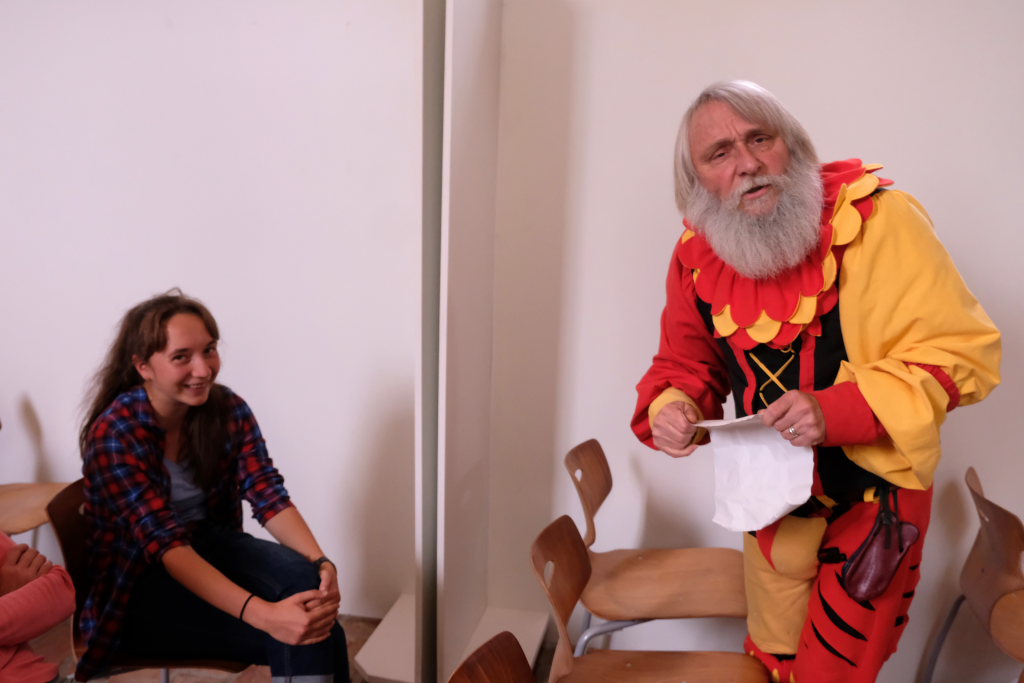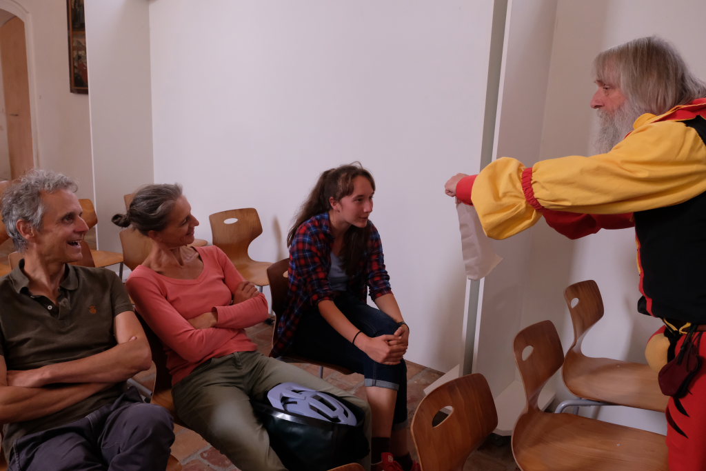 Dass sich in den 500 Jahren einiges bei den Lebensumständen der Menschen verändert hat, das konnte das kleine Fabelwesen dem Landsknecht deutlich machen. Angefangen vom Schuhwerk, das er bei den Aufführungs-Besuchern entdeckte, bis hin zum Bildungswesen. Nicht fassen konnte Kunz, dass inzwischen sogar Mädchen und Frauen Lesen und Schreiben lernten, anstatt auf dem Feld zu arbeiten. Zum Beweis, dass dies wirklich der Fall ist, ließ er ein junges Mädchen die von ihm mitgebrachten 12 Artikel vorlesen.