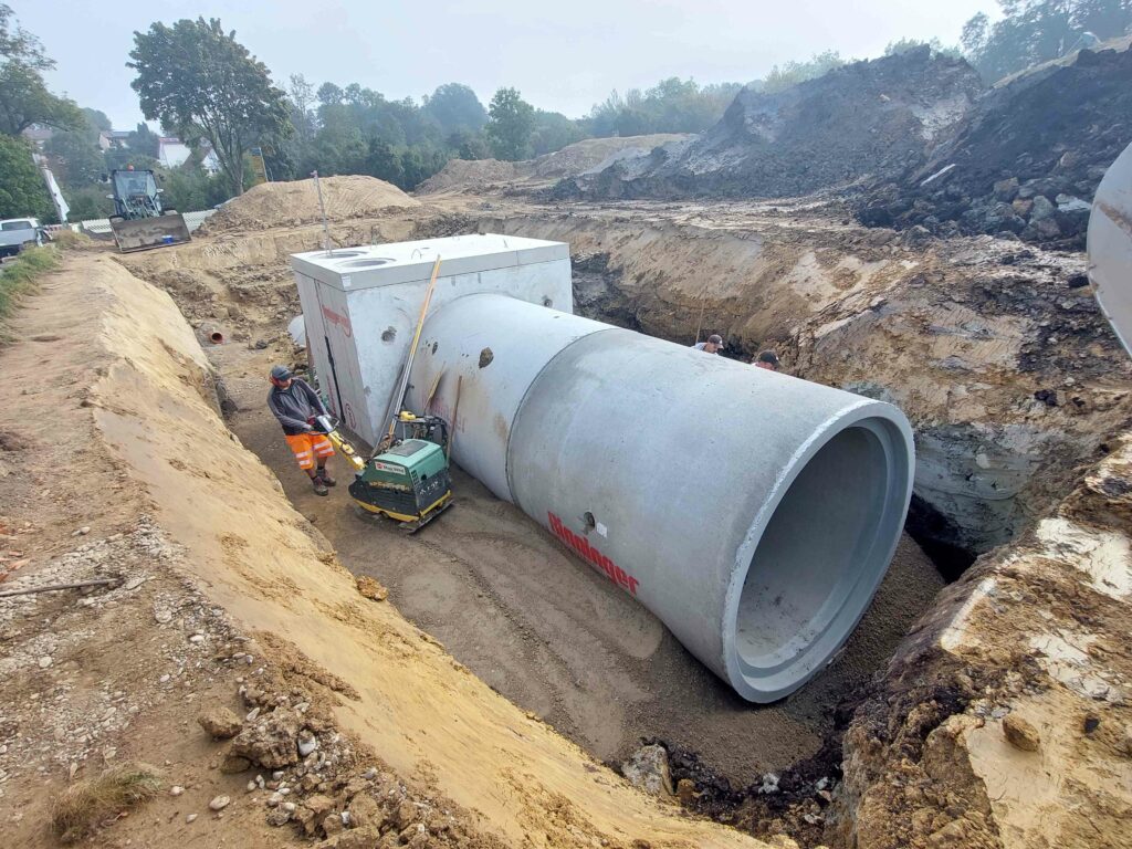 Der Transport der Stauraumbauwerke erfolgte über die Logistikabteilung des Unternehmens Max Wild. Für die provisorische Zufahrt des Autokrans zur Versetzung der Stauraumbauwerke mussten dabei Stahlplatten verlegt werden. Marvin Wirth (Max Wild GmbH) ergänzt. „Die Zusammenarbeit mit dem Hause Rinninger funktioniert seit Jahren sehr gut. Wir erhalten hier sehr nützliche Unterstützung bei Planung, Statik, Logistik und Montage. Rinninger lieferte für den Bau des Stauraumkanals vom Standard-Betonrohr bis zum Sonderbauwerk alles aus einer Hand. Dies reduziert Schnittstellen und Reibungsverluste und ermöglichte einen reibungslosen Einbau der Betonelemente,“ so Wirth.