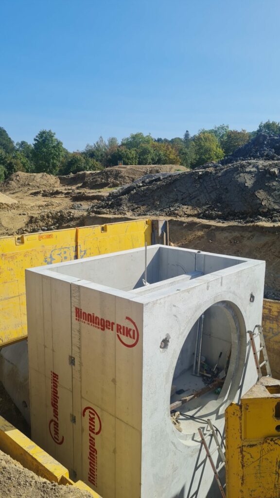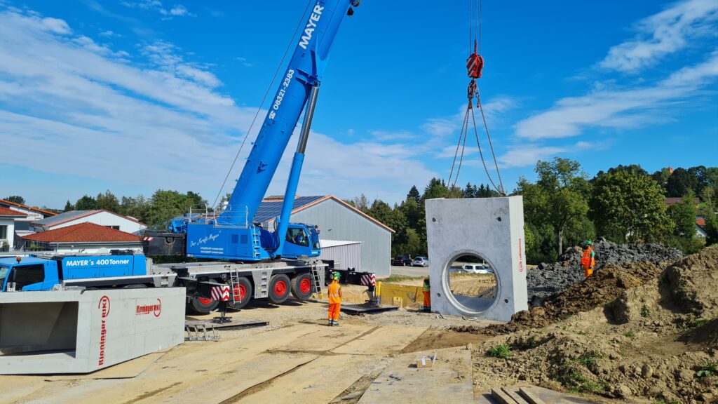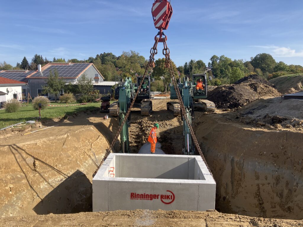 Bad Wurzach / Kißlegg – Das Gewerbegebiet „Ziegelwiese-Süd” liegt am südöstlichen Ortsrand von Bad Wurzach an der B465 in Richtung Leutkirch. Seit Mitte 2023 wird das Areal in südöstlicher Richtung um ca. 1,5 Hektar erweitert. Aufgrund der topographischen Lage legten die Planer hierbei besonderes Augenmerk auf die Entwässerung. Einen 80 Meter langen Stauraumkanal samt aller Rohre, Schächte und Sonderbauwerke aus Stahlbeton entwickelte, fertigte und lieferte das Unternehmen Hans Rinninger u. Sohn GmbH u. Co. KG aus Kißlegg im Allgäu. Mit der Planung der Erweiterung war die Fassnacht Ingenieure GmbH (Bad Wurzach-Arnach) betraut; die Stadt Bad Wurzach vergab den Tiefbau – gemäß den planerischen Vorarbeiten durch Fassnacht – an die Max Wild GmbH. Diese bestellte die zum Teil in Sonderanfertigung hergestellten Elemente bei dem Betonwaren-Spezialisten Rinninger in Kißlegg. Der Einbau der mächtigen Betonelemente erfolgte im Frühjahr 2024.