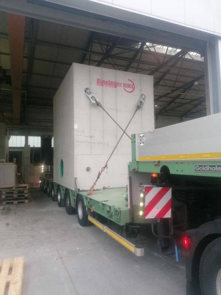 Das Auslaufbauwerk wird in der Halle verladen. Foto: Hans Rinninger u. Sohn GmbH u. Co. KG