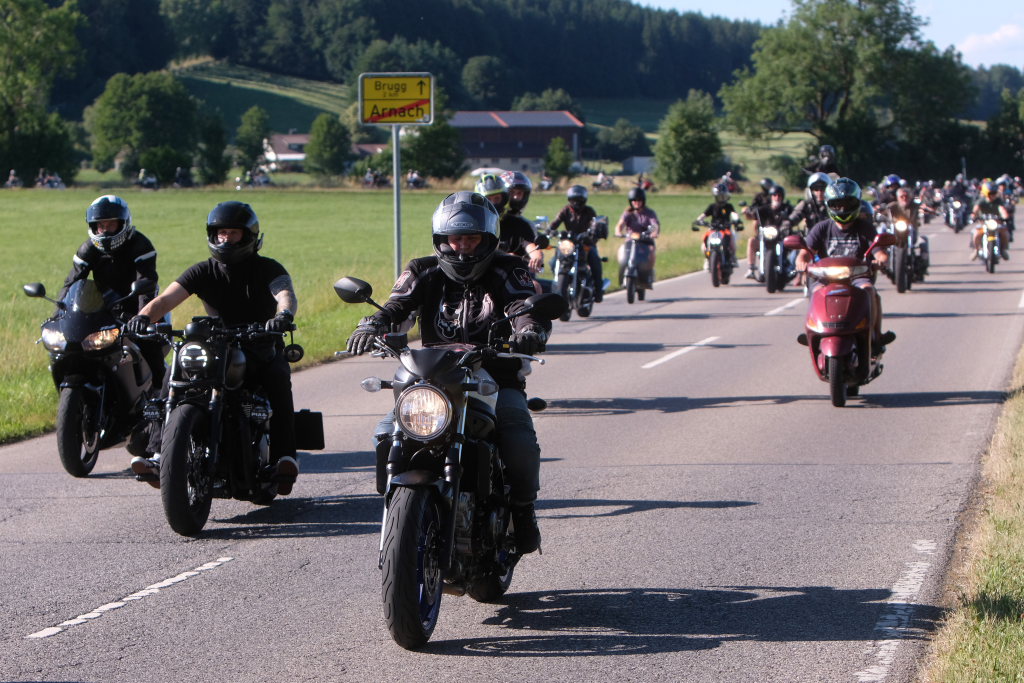 Wie im Vorjahr wurde diese an diesem wieder sehr heißen Tag zu einem einmaligen Event. Zirka 220 Motorradfahrer starteten mit ihren Gefährten in Richtung des Ortes, zu der Dorfrundfahrt, nachdem die Arnacher Kirchturmuhr die 18. Stunde des Tages eingeläutet hatte. So mancher sorgte mit blauen Fahnen aus den Zweitakter-Auspuffrohren in der Gemeinde wieder für benzin-geschwängerte Luft. Nicht fehlen durfte natürlich der obligatorische Boxenstopp – in diesem Jahr wieder beim Lagerhaus, wo es wieder Schmalzbrot und Traubenmost zur Stärkung gab, nachdem dieser im Vorjahr wegen der Sanierung der Ratperoniusstraße auf dem Dorfplatz stattfinden musste.
