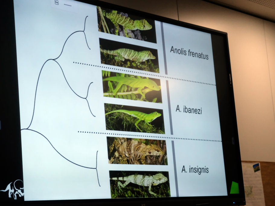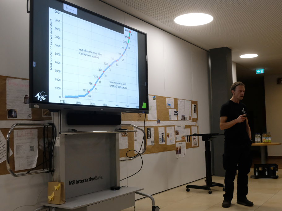 Auch die Frage, wieviele Arten es weltweit gibt, ließ der Science-Slammer per Abstimmung klären. Dass die Antwort D „nichts Genaues weiß man nicht“ die richtige war, gleich neben der als Anhaltspunkt dienenden von 8-10 Millionen, darf nicht verwundern: Auf der einen Seite verschwinden jährlich viele Arten, auf der anderen Seite werden im fünf Jahresrhythmus allerdings von Wissenschaftlern jeweils 1000 neue Arten entdeckt.