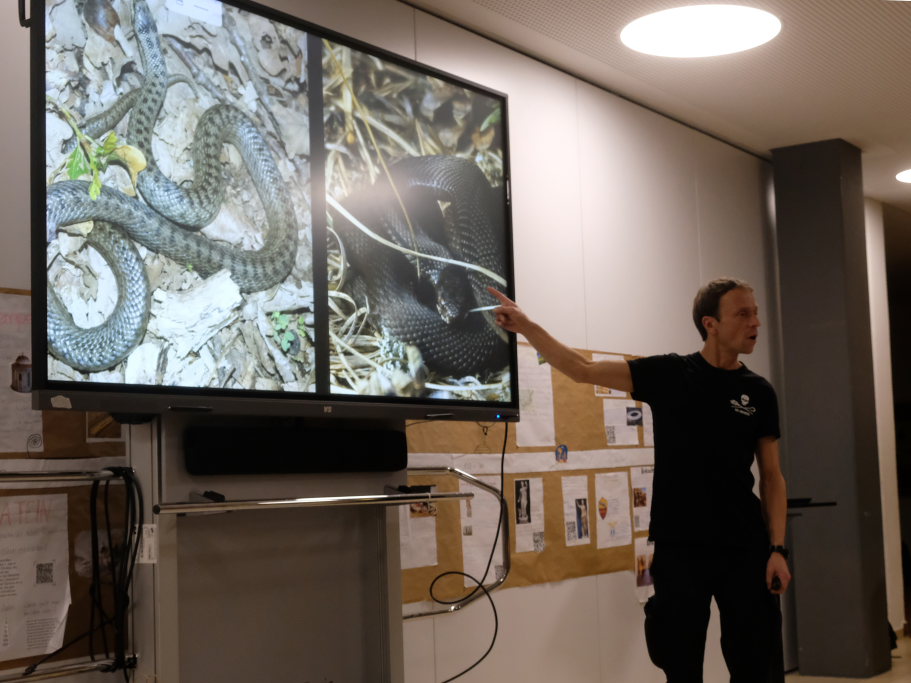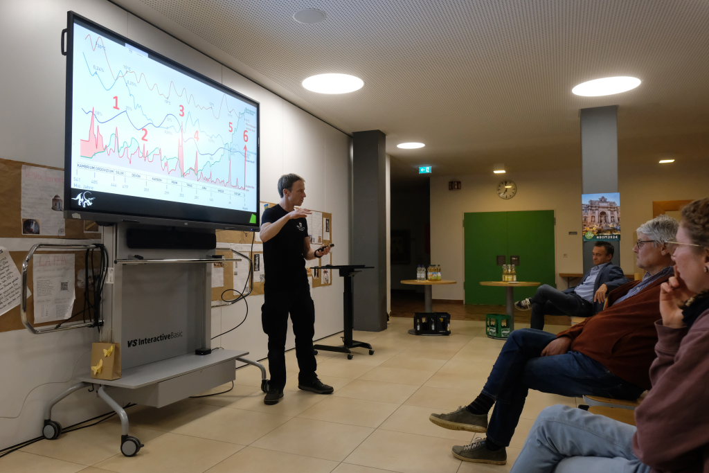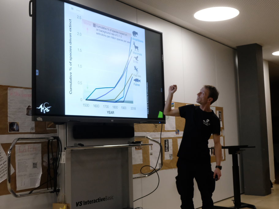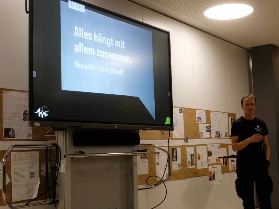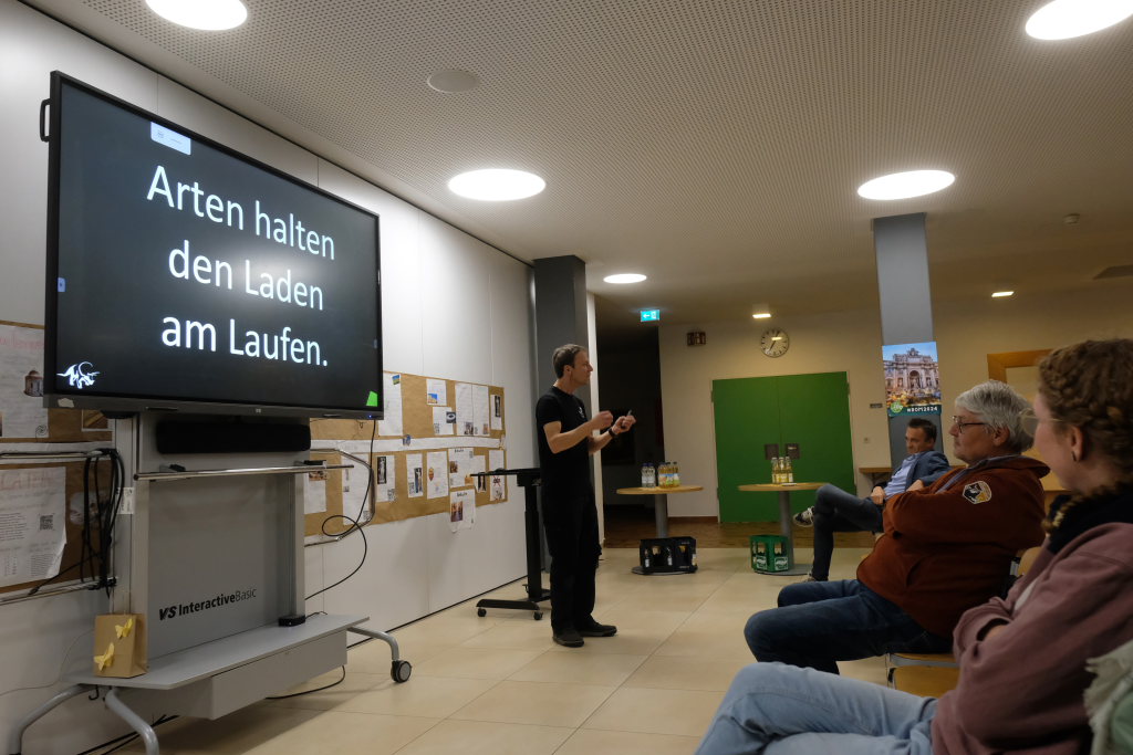 „Alles hängt mit Allem zusammen“, dieses Zitat von Alexander von Humboldt, dem großen Forschungsreisenden des 18. und 19.Jahrhunderts empfindet Lotzkat als „den coolsten Ausspruch, den je ein Berliner getätigt hat“. Und er treffe die Kernaussage zum Thema Artenvielfalt. Der Science-Slammer lockerte seine wissenschaftlichen Ausführungen immer wieder mit kleinen Ratespielen auf und garnierte dessen Ergebnisse mit coolen Sprüchen. Etwa beim Eröffnungsrätsel, als 100 % der rund 60 Zuhörer die Wespe als den Plagegeist identifizierten, der im Sommer süßes zu Essen zur Qual macht. „Manchmal funktioniert Demokratie ja doch“.
