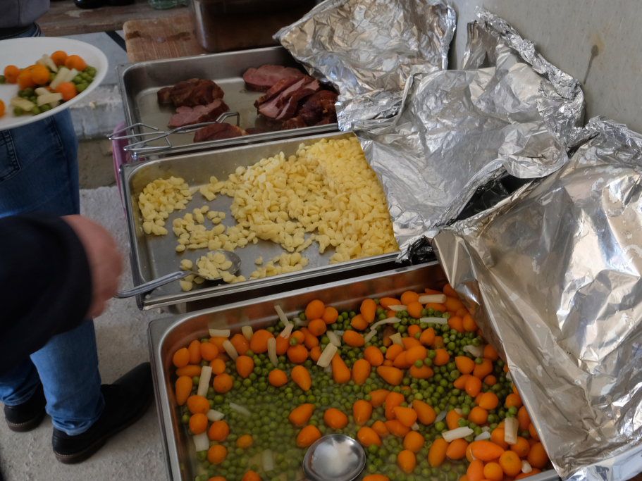 Diesen Richtspruch bekam in gerahmter Form Ortsvorsteher Leupolz zur Aufbewahrung, damit er später das neue Florianstüble der Eintürner Feuerwehr zieren möge. Und natürlich gehören zu einem Richtfest auch gutes Essen und Trinken und hier hatten sich die Verantwortlichen nicht lumpen lassen und in der zukünftigen Fahrzeughalle eine Tafel mit warmem Essen und kalten Getränken aufgestellt.