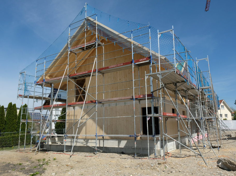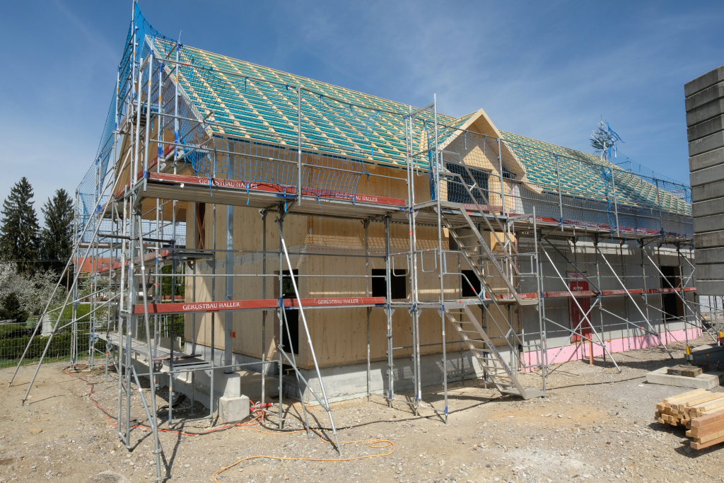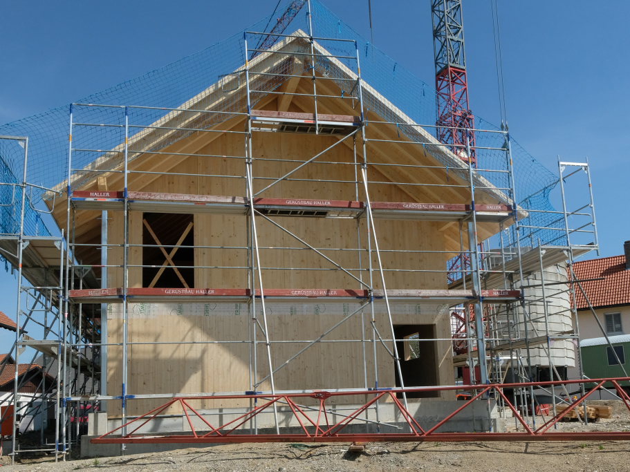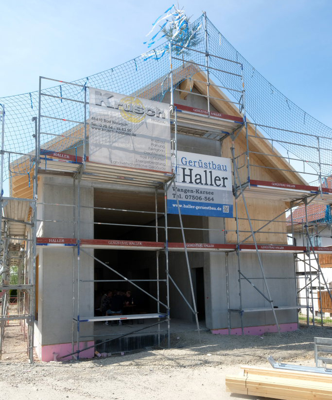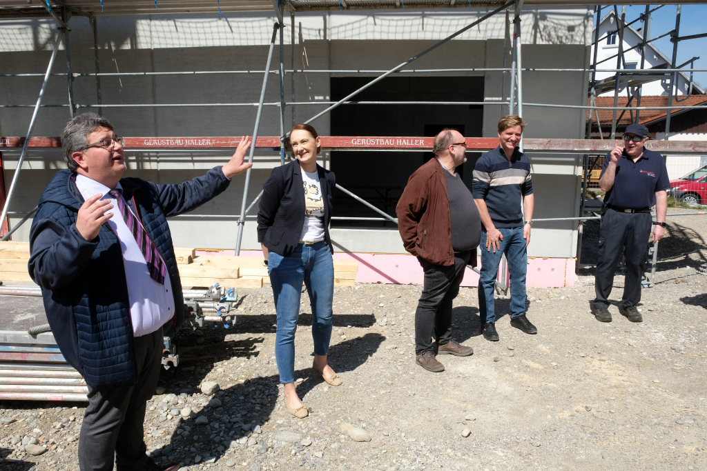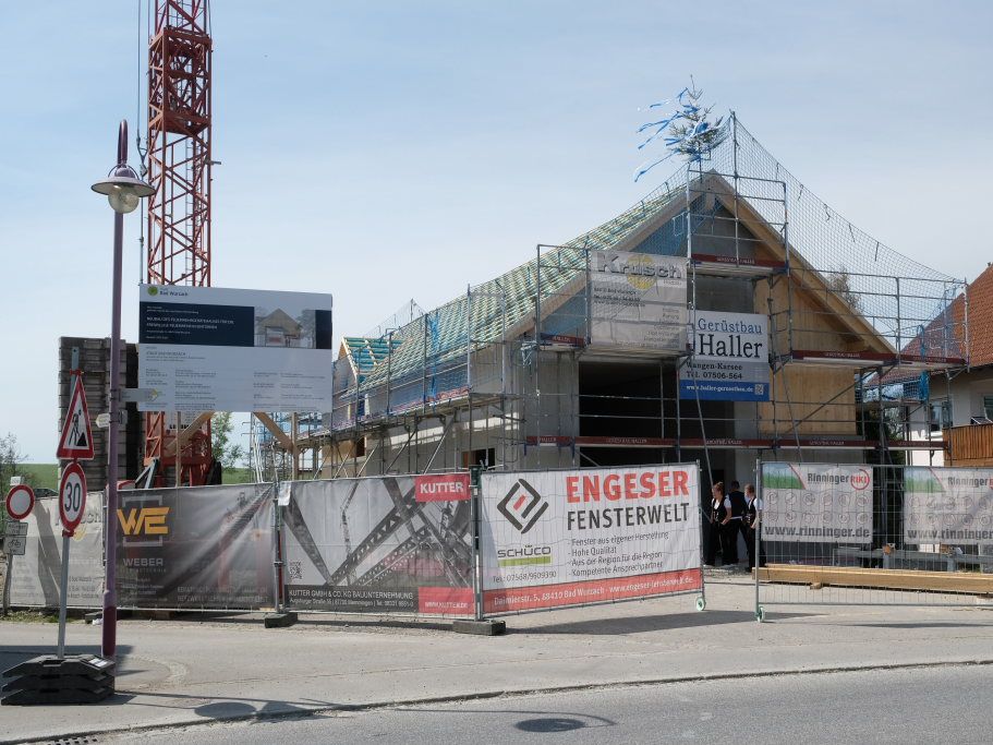 Nachdem es lange so ausgesehen hatte, als würde bei dem Neubau nicht viel vorwärtsgehen und manche Eintürner schon dem Ortsvorsteher mit Sprüchen wie „Was wird des denn für a Kista“ gekommen waren, wurde nun Richtfest gefeiert. Die Bürgermeisterin konnte, nachdem die Zimmerei Krusch in den letzten gut zwei Wochen den hinteren aus Holz in Fertigbauweise gefertigten Teil fertiggestellt sowie das Dach („mit Dachvorsprung!“, wie Leupolz erfreut feststellte / im Gemeinderat hatte es hierum heftige Diskussionen gegeben) montiert hatte, mit Fug und Recht sagen: „Das ist jetzt kein Rohbau mehr, sondern ein Haus.“ Sie freute sich, dass der Bau bisher unfallfrei über die Bühne gegangen war und hofft dies auch für die Zukunft. Ihr Dank für die gute Zusammenarbeit ging an alle Beteiligten.