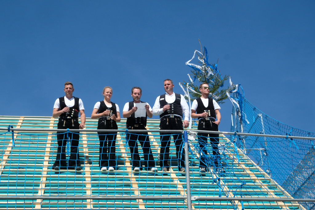 Nachdem der Richtbaum schon am Dachfirst montiert war und seine weißen und blauen Bänder im Wind flatterten, stiegen die fünf Zimmerleute (unter ihnen auch eine junge Zimmerin) von Holzbau Krusch dem Gebäude im Wortsinne aufs Dach. Zimmerer Hermann Bucher war es vorbehalten den Richtspruch für das Gebäude zu sprechen. Darin heißt es unter anderem: „Nun hat der Bau sich nun erhoben, nicht groß zwar, doch auch gar nicht klein; das Werk mag seinen Meister loben, ich lege den Segen noch hinein.“ Und: „Ein solches Werk kann nur geschehen, wenn jeder brav an seiner Stelle und alle fest zusammenstehen, der Meister, Lehrling und Geselle.“ „Drum wünsche ich, so gut ich´s kann, so kräftig wie ein Zimmermann, mit stolz empor gehob´nem Blick, der neuen Halle recht viel Glück.“