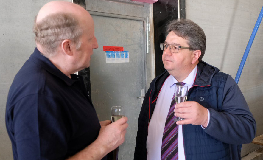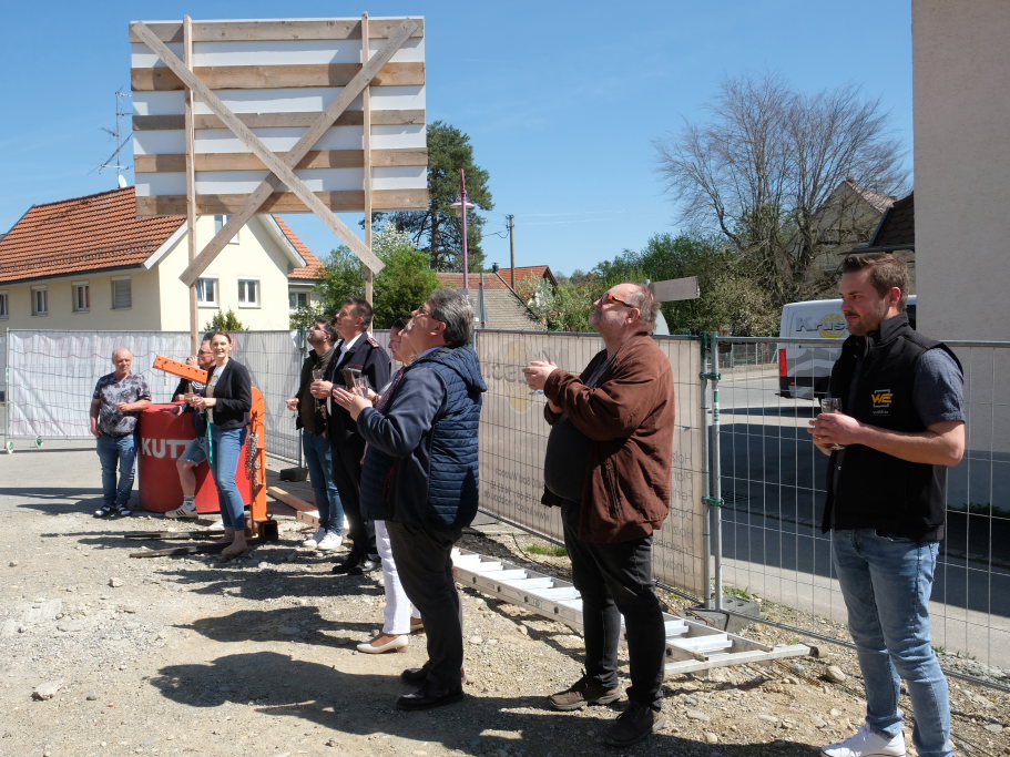 Nach mehreren Schlucken, mit denen die Bauherrschaften, die Planer und die Handwerker selbst gefeiert wurden, warf er das leere Glas zu Boden. Denn „Scherben bedeuten Glück und Segen, der Bauherrschaft auf allen Wegen.“