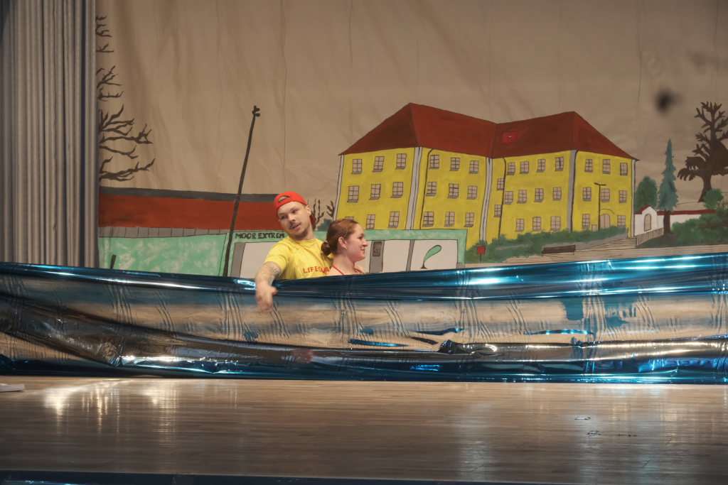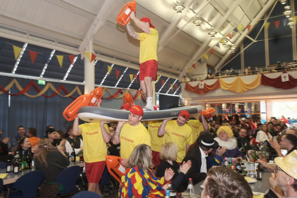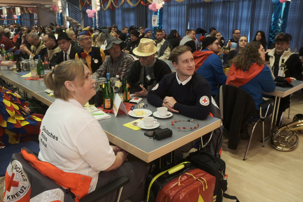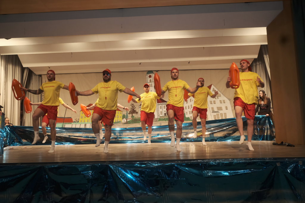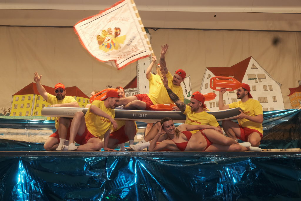 Auch Bürgermeisterin Alexandra Scherer, die sich – patriotisch – im in den Stadtfarben gehaltenen Schnepfenhäs den Gäste-Zunftmeistern präsentierte, kam nicht mit leeren Händen. In ihrem Grußwort gab sie ihrer Freude Ausdruck, dass das Kurhaus so belebt wurde, nachdem die Riedmeckeler in dieser Saison alle ihre diesjährigen Veranstaltungen (Hockete, Seniorenfasnet und Kinderfasnet) im Kursaal abgehalten haben. Zu David Hasselhoffs „I‘ve been looking for freedom“ glänzte danach die Männergarde der Zunft im Baywatch-Outfit bei ihren getanzten akrobatischen Einlagen.