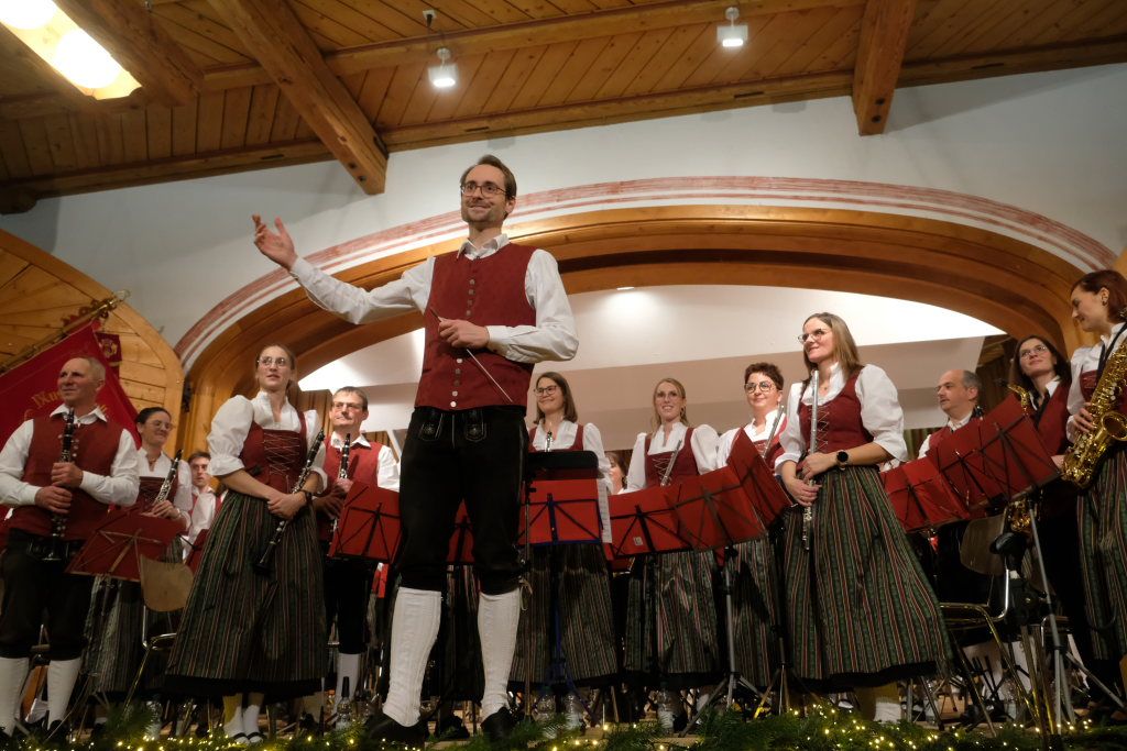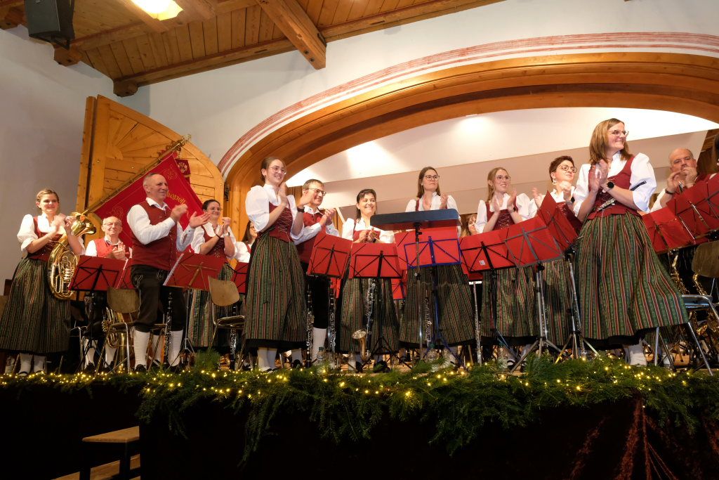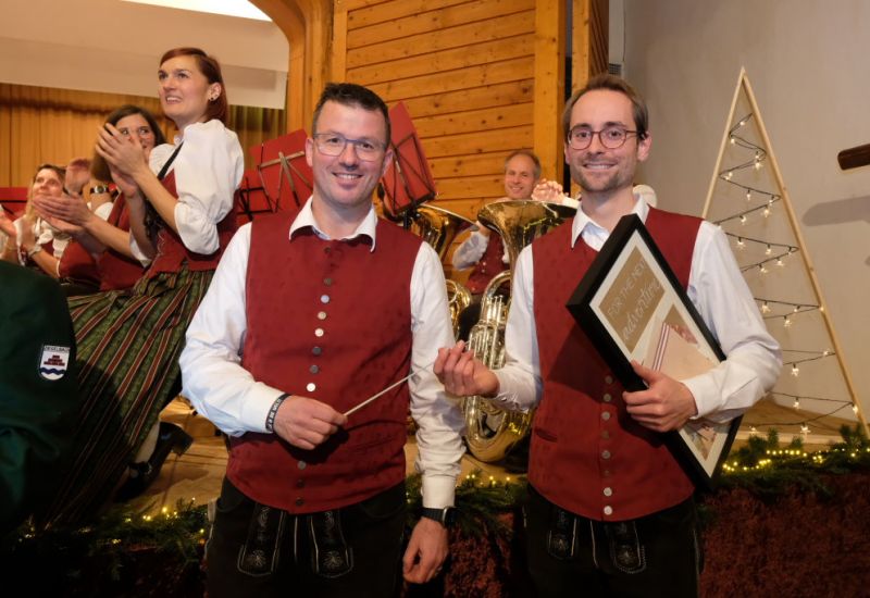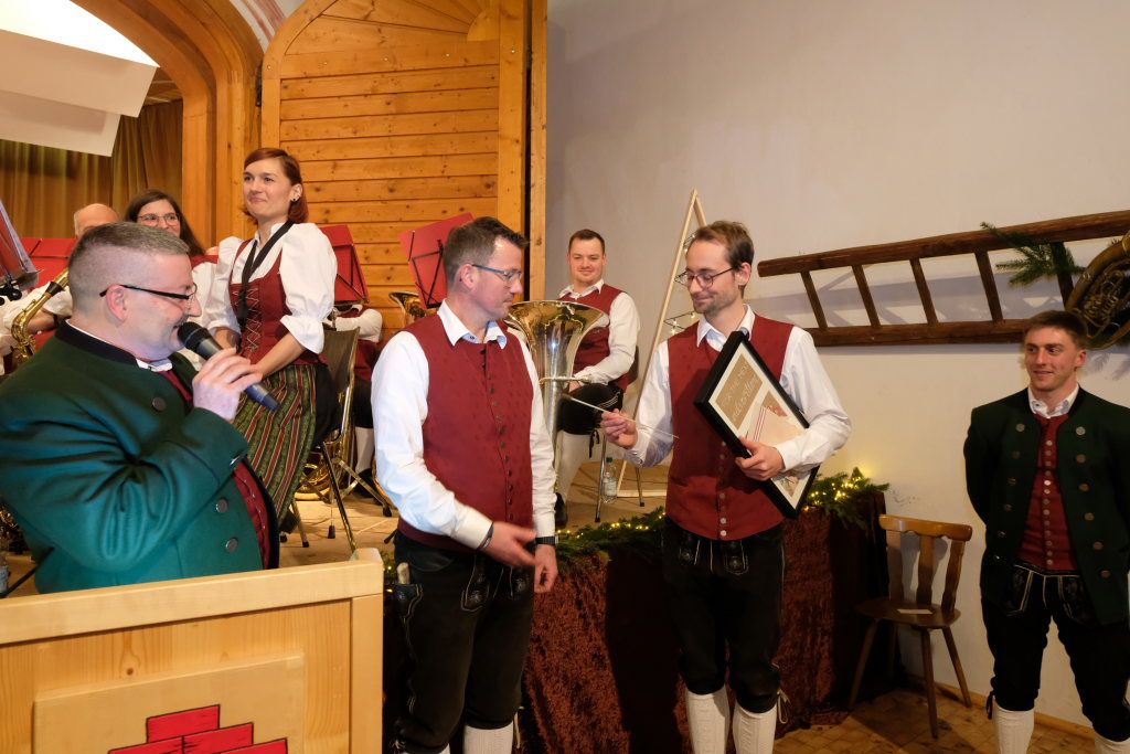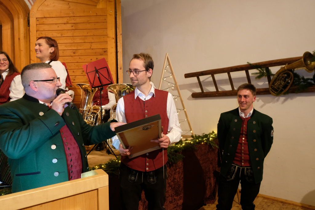 Oliver Herz wird von “seiner” Musikkapelle mit Beifall und einem Geschenk als Dirigent verabschiedet. Als Hornist macht er weiter.
