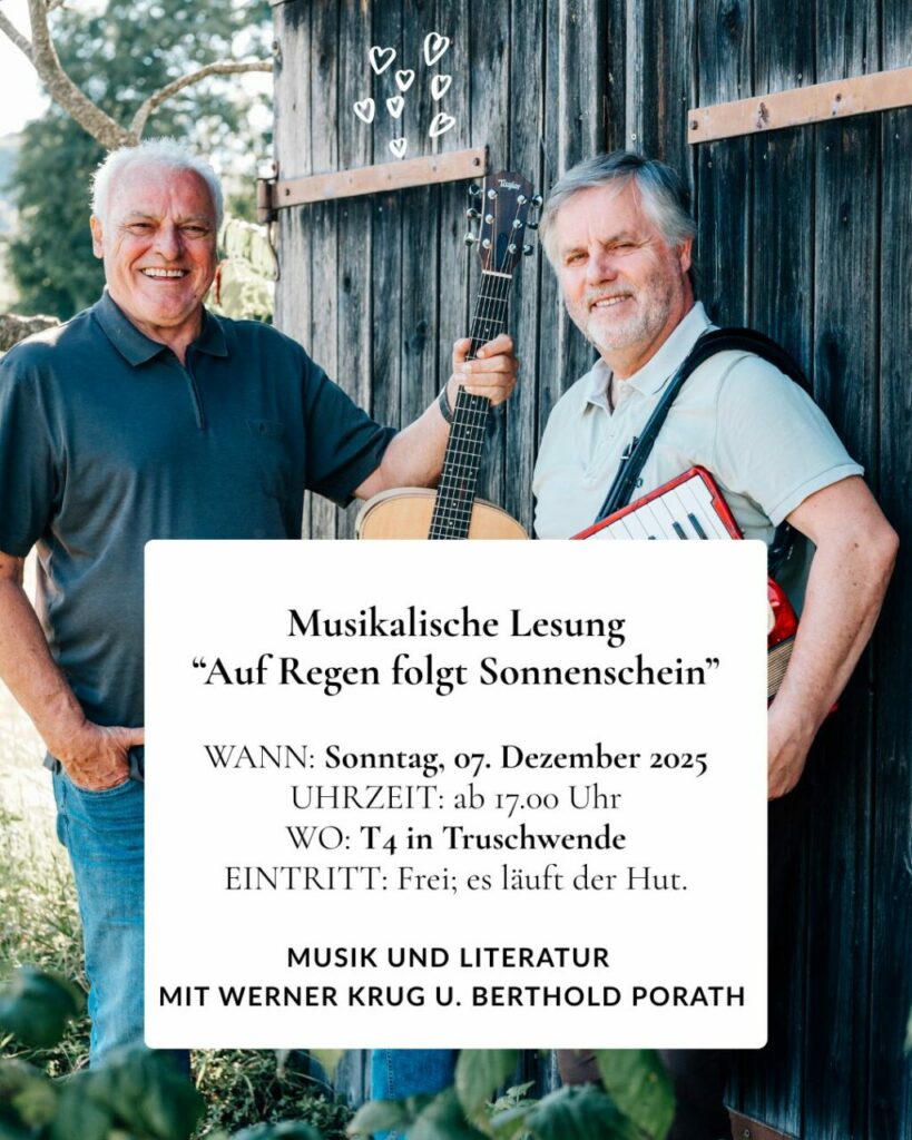 Am Sonntag, 7. Dezember, darf ich etwas tun, das mir sehr am Herzen liegt: Ich lese aus meinem Buch „Auf Regen folgt Sonnenschein“ – begleitet von Musik und einem guten Glas Wein oder Bier. Ab 17.00 Uhr öffnen sich die Türen von Roland Ernles Restaurant T4 in Truschwende (bei Bad Wurzach).