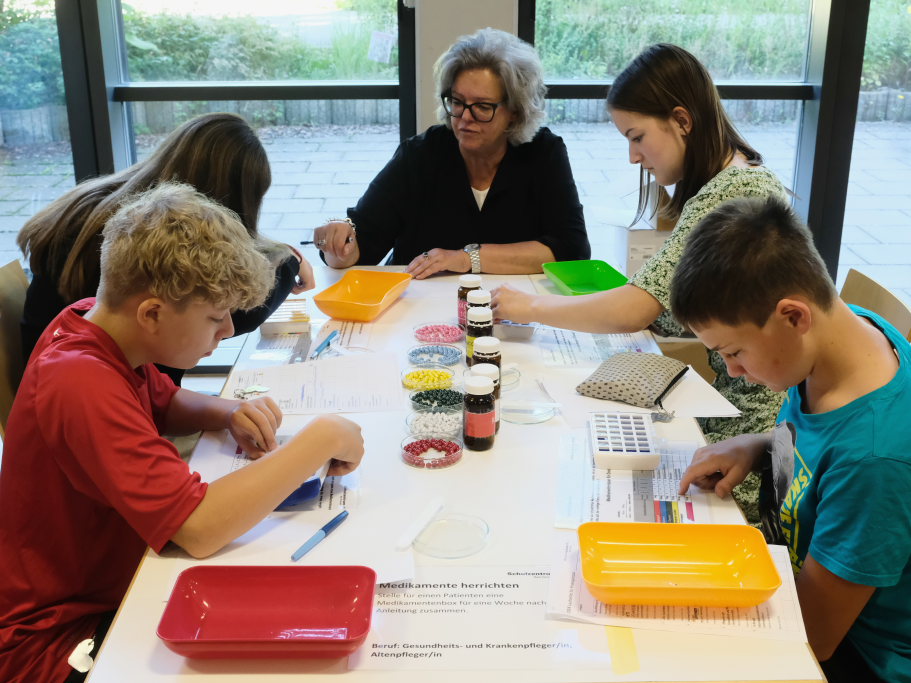 Eine gute Logik- und Vorstellungskraftschulung ist das Zusammenstecken eines Holz-Modells – wie es bei den Zimmerleuten gefordert ist. Anspruchsvoll war auch die Aufgabe, als Lagerist einen Auftrag aus mehreren Einzelteilen zusammenstellen. Für den Pflegeberuf stand die Befüllung einer Medikamentenbox mit verschiedenen Tabletten und Heilmitteln an. Beim Platz des IfP bekamen die Schüler im Wortsinne Einblicke in die menschliche Anatomie.
