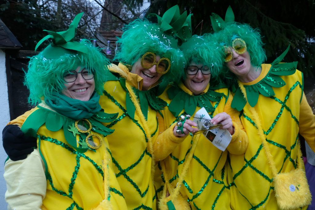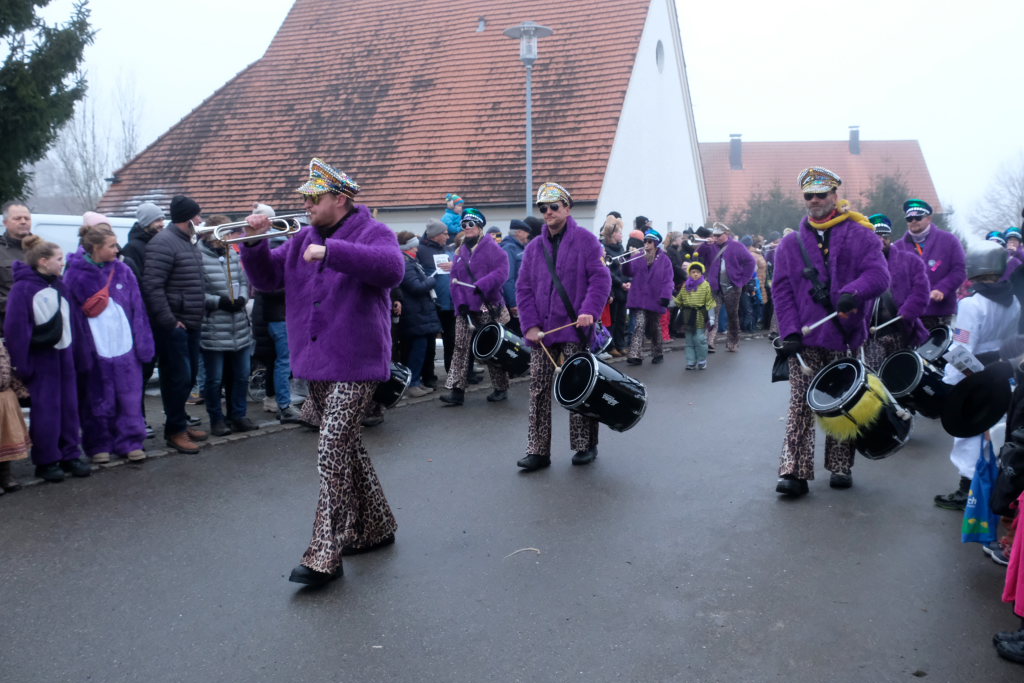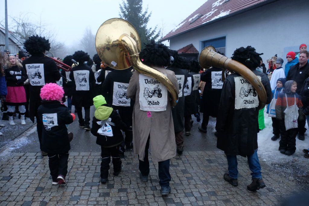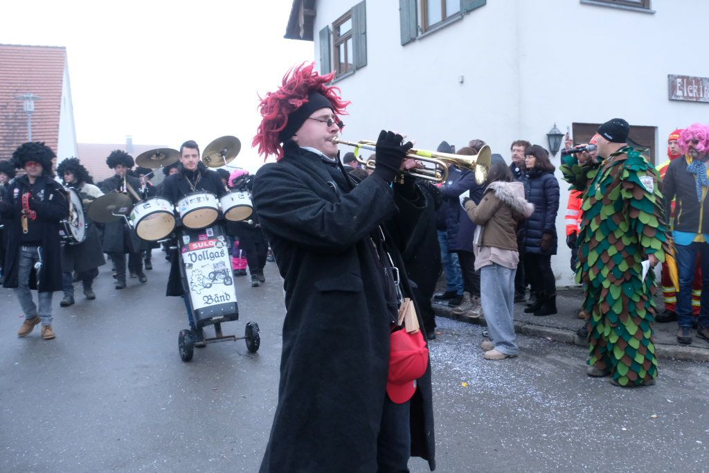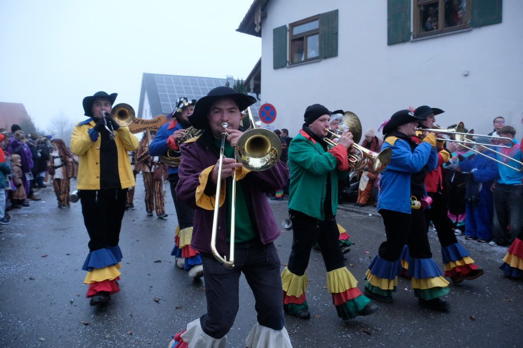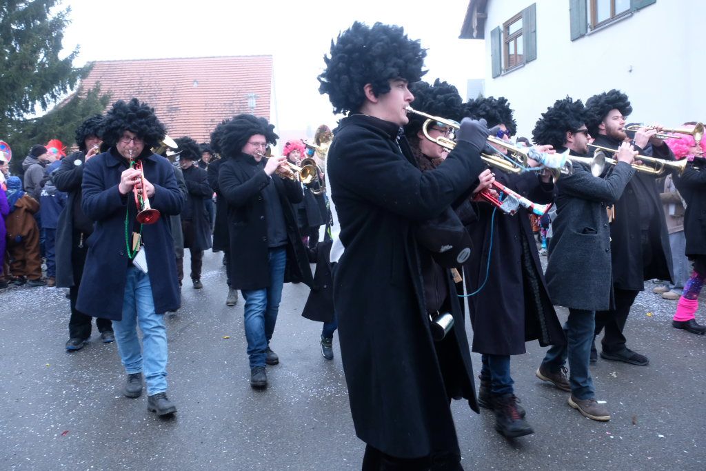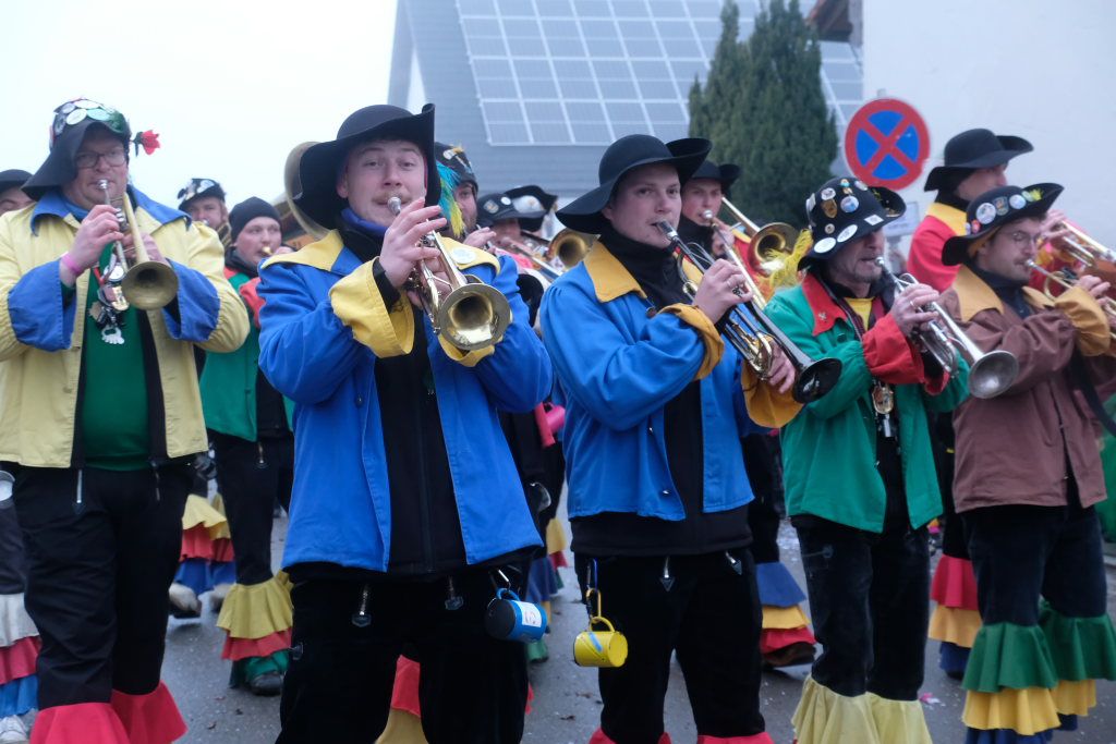 Neun der 36 Umzugspositionen – Zünfte wie die Riedmeckeler aus Wurzach oder die Eintürner Deifelsböck, die ihre drei Kilometer lange Anreise beinahe zu Fuß hätten zurücklegen können, waren aus der Großgemeinde Bad Wurzach gekommen. Immerhin acht Musikgruppen wie der Fanfarenzug Bad Wurzach, die Seibranzer Vollgas-Bänd und die Schalmeien „D´Riedpatzen– oder die Guggenmusik Röthenbach sorgten mit ihren Stimmungsliedern für ausgelassene Partylaune, Für letztgenannte war es ebenfalls ein Heimspiel, spielten darin doch viele Musiker des Musikvereiness Arnach mit. Es waren aber auch Zünfte mit längerer Anreise dabei, wie etwa die Burghexen aus Hornstein oder die traditionsreiche NZ Lachende Kuh aus Isny, die sich dann im Partyzelt ordentlich etwas auf die Ohren gaben.