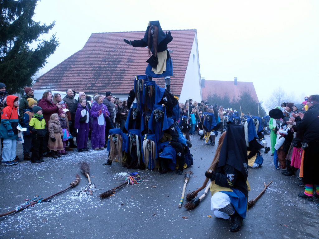 Paradiesisch dürften sich die Hästräger und Musikanten der 36 Gruppen gefühlt haben, auf ihrem Weg den Kirchberg hinauf in Richtung Festhalle: In Dreier-, ja Viererreihen drängten sich am gesamten Umzugsweg bestens gelaunte „Mäschkerle“, die fleißig die Narrenrufe wie das „Bock – Wulle“ der heimischen Zunft, „Worum – Dorum“, „Deifels-Bock“ oder „Dugget Eich D´Langjupp schleicht“ skandierten. Die Gruppen dankten ihnen mit dem Bau beeindruckender Hexen- und Narrenpyramiden. So etwa die Kresenzhexen aus Wolfegg, die ihre akrobatischen Fähigkeiten unter Beweis stellten und noch gemäß ihrem Narrenspruch „Hexaholz – raucha soll´s“ den Kirchberg in dichten Nebel tauchte, so wie später die Hauerzer Baadgoischdr diesen in ihrer Hausfarbe in Blau einhüllten.