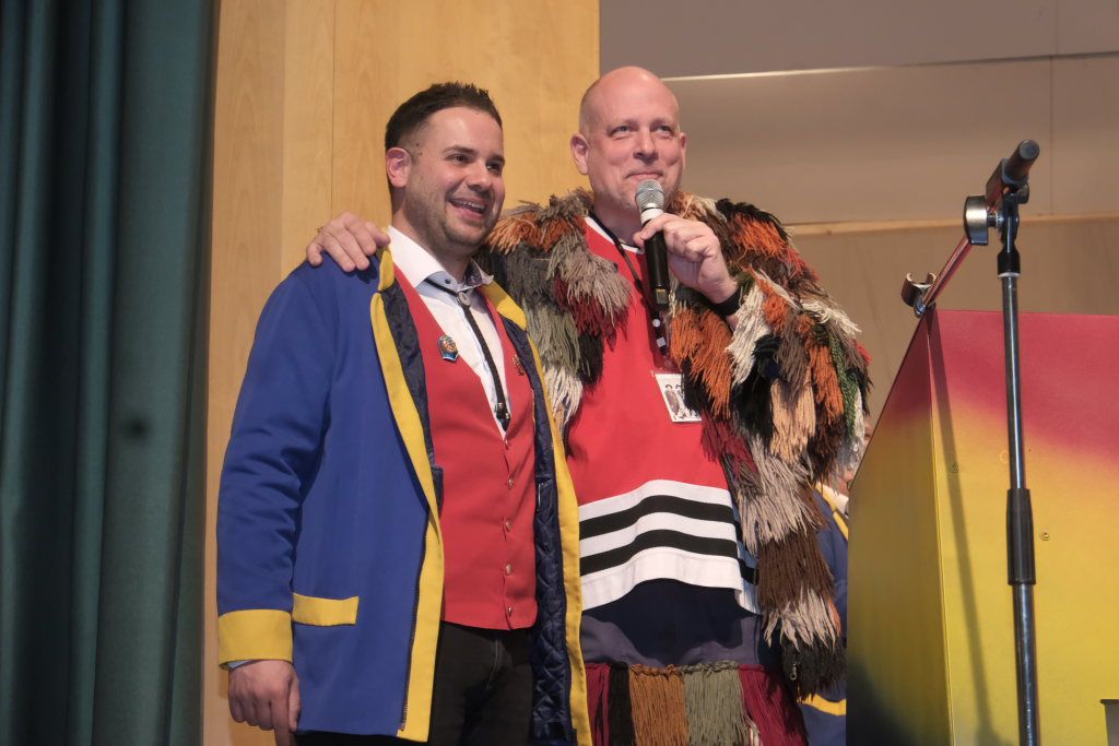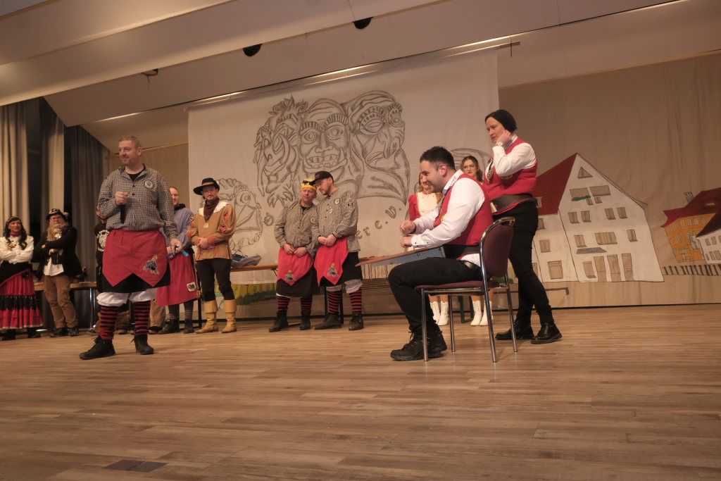 Dann trat der Seibranzer Zunftchef Willi „WilliBu“ Butscher ans Mikrofon, und ließ mit seiner Gesangseinlage das Stimmungsbarometer im Saal steigen. Bei dem am Abend vorher bei der Riedbeben-Party gehörten Hit von Rumbombe ließ er den Saal das titelgebende Wort singen. Selbiges taten auch die die Vertreter der Haidgauer Sippe bei ihrer Hymne „Lustig ist das …Leben“, allerdings wohl aus anderen Beweggründen…