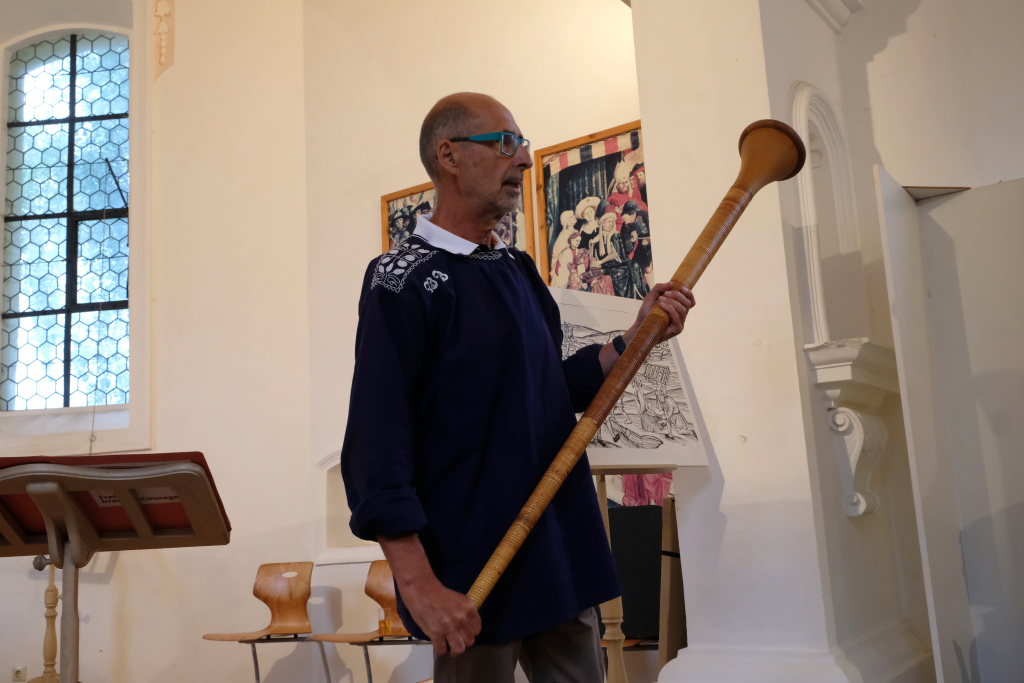 Aber Bernhard Bitterwolf konnte auch einige Unsauberkeiten bei der Umsetzung von Gehörtem zum Schriftlichen aufdecken. Etwa bei dem Lied „Die Glocken vom Bernwartsturm“. Darin ist von einem Büffelhorn die Rede. Büffel gab es jedoch hier nie. Gemeint war sicherlich der Piffel, das Instrument der Viehhirten. Und Bitterwolf kommt nie nach Wurzach ohne seinen Piffel, den er sich nach dem Vorbild des auf dem Deckengemälde der St. Verena-Kirche abgebildeten Instrumentes bauen ließ.