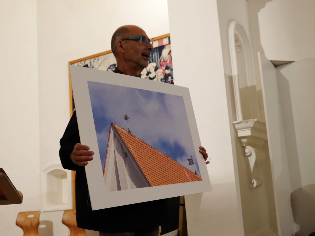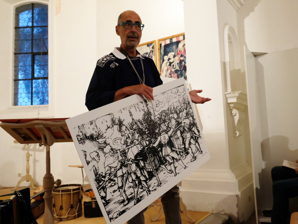 Apropos Kirchen: Er hatte auch ein Bild der Pfarrkirche Gaisbeuren dabei, auf deren Spitze ein Morgenstern prangt, eine in der Zeit vor dem Bauernkrieg tödliche Waffe in den Händen der Landsknechte und Ritter bei kriegerischen Auseinandersetzungen.