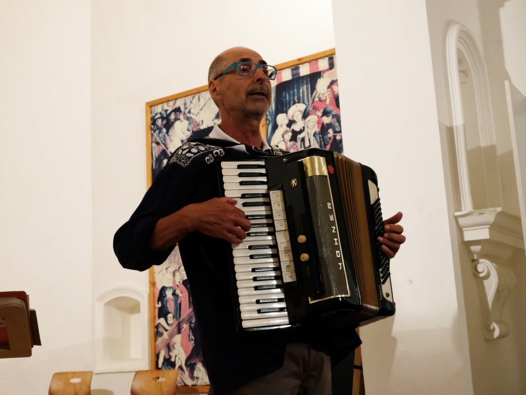 Bekleidet im bäuerlichen Alltagshäs, dem Blauhemd – oder auch Russenkittel genannt – hatten die beiden verschiedene Musikinstrumente aus jener Epoche mitgebracht. Und nicht zu vergessen ein aufwendig gestaltetes Liederheft mit dem Titel „Für die Freiheit – Bauernlieder aus fünf Jahrhunderten“, das im Eintrittspreis mit inbegriffen war. Damit hatte jeder Besucher Gelegenheit, die von den Beiden vorgeschlagenen Lieder mitzusingen, wovon auch reichlich Gebrauch gemacht wurde.