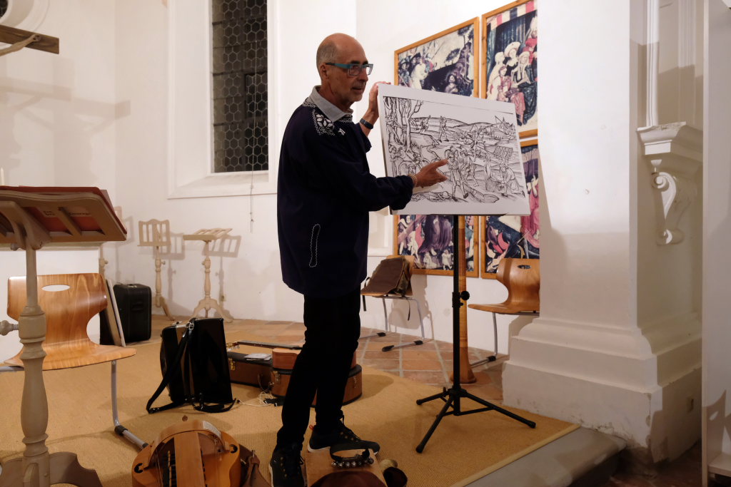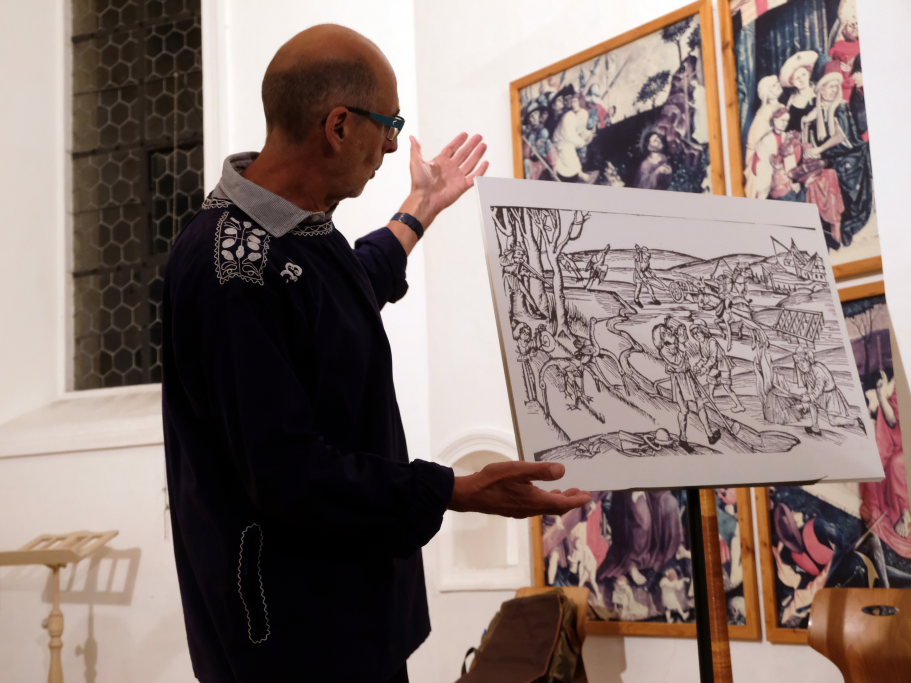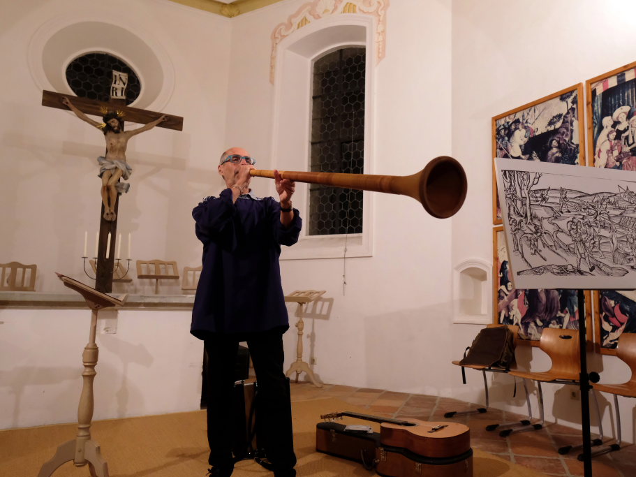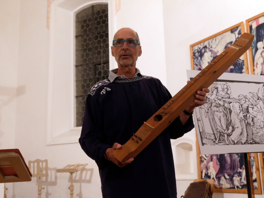 „Volkslieder haben sich im Laufe der Zeit verändert.,“ sagte Bitterwolf am Beginn des Singabends. Aber Bernhard Bitterwolf konnte auch einige Unsauberkeiten bei der Umsetzung von Gehörtem zum Schriftlichen aufdecken. Etwa bei dem Lied „Die Glocken vom Bernwartsturm“, das Bitterwolf nur wegen seiner ungenauen „Übersetzung“ als Beispiel heranzog. Darin ist von einem Büffelhorn die Rede. Büffel gab es jedoch hier nie. Gemeint war sicherlich der Piffel, das Instrument der Viehhirten. Bitterwolf vergaß auch nicht auf die Darstellung im Deckengemälde von St. Verena hinzuweisen, wo ein Viehhirte so ein Instrument im Arm hält. Apropos Kirchen: Er hatte auch ein Bild der Pfarrkirche Gaisbeuren dabei, auf deren Spitze ein Morgenstern prangt, eine in der Zeit vor dem Bauernkrieg tödliche Waffe in den Händen der Landsknechte und Ritter bei kriegerischen Auseinandersetzungen.