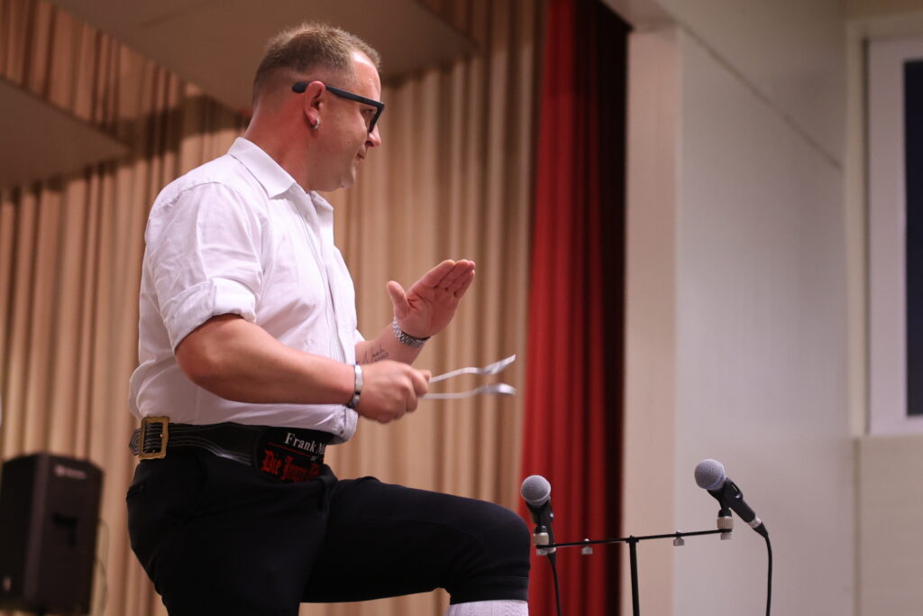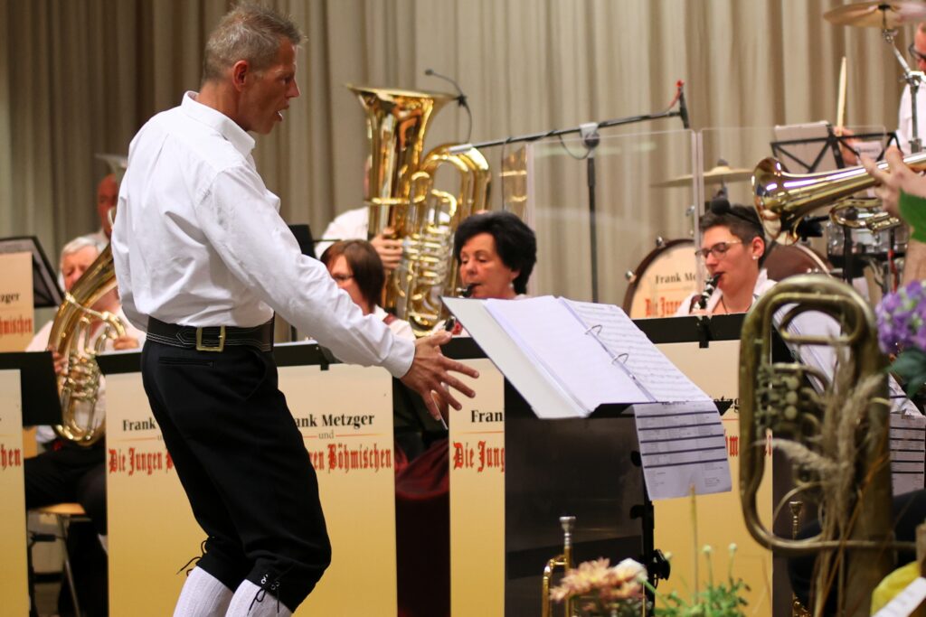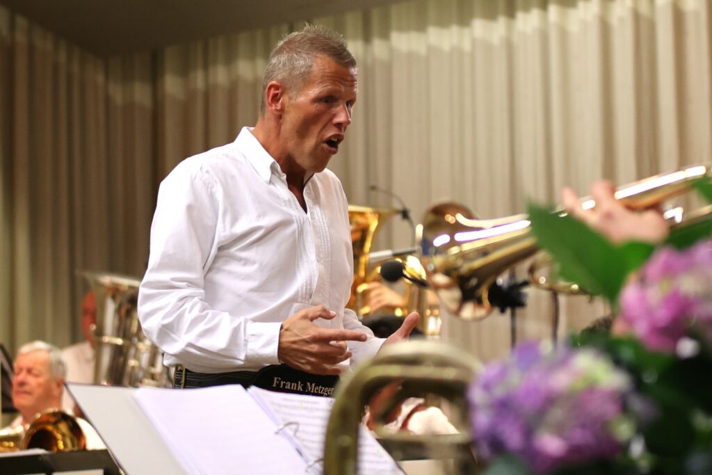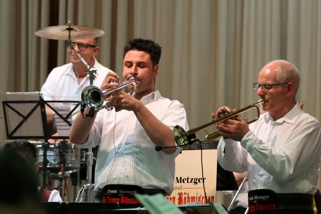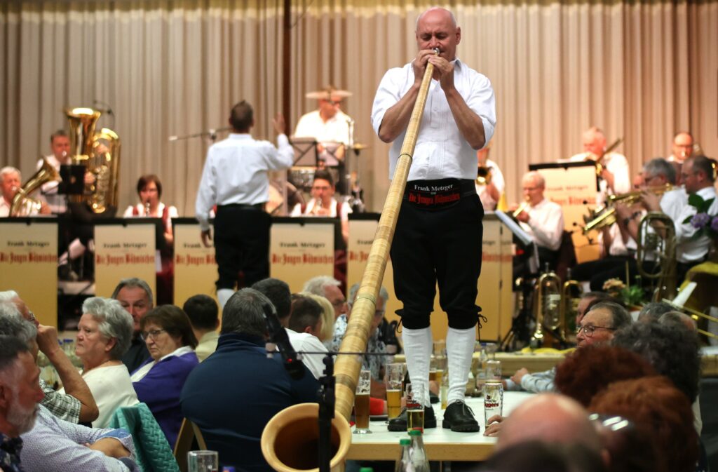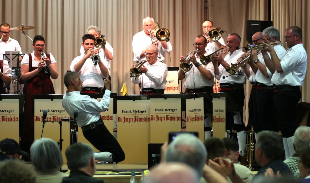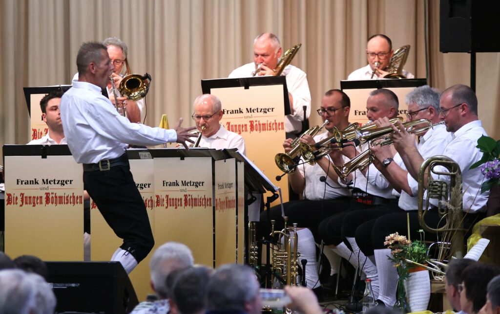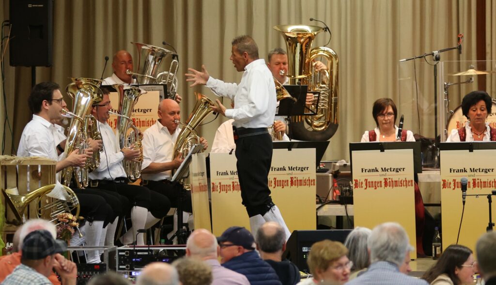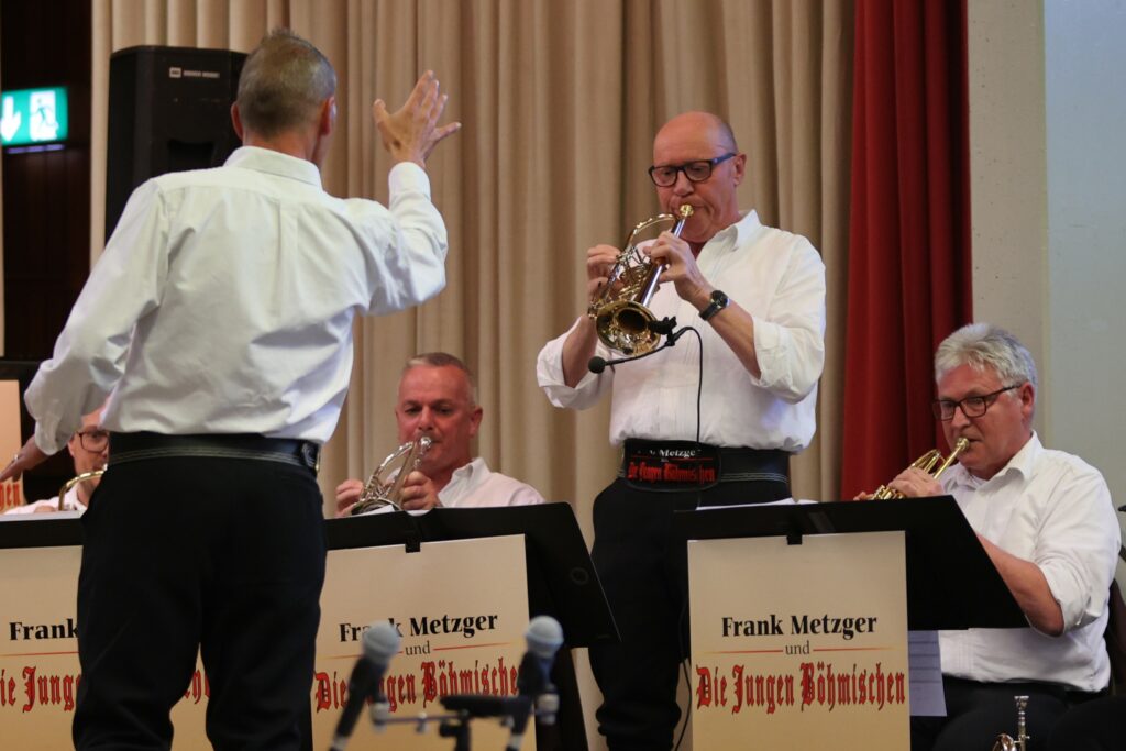 Unter der Leitung von Frank Metzger, der eine treue Musikerschar um sich versammelt hat, wurde der Abend zu einem echten Erlebnis. Metzger, der mit vollem Körpereinsatz dirigierte, sorgte für mitreißende Momente – nicht zuletzt durch seinen legendären Luftsprung beim Abschlag. Fast auf dem Boden liegend forderte er seine Musiker zu Höchstleistungen auf, was die Begeisterung im Saal nur steigerte.