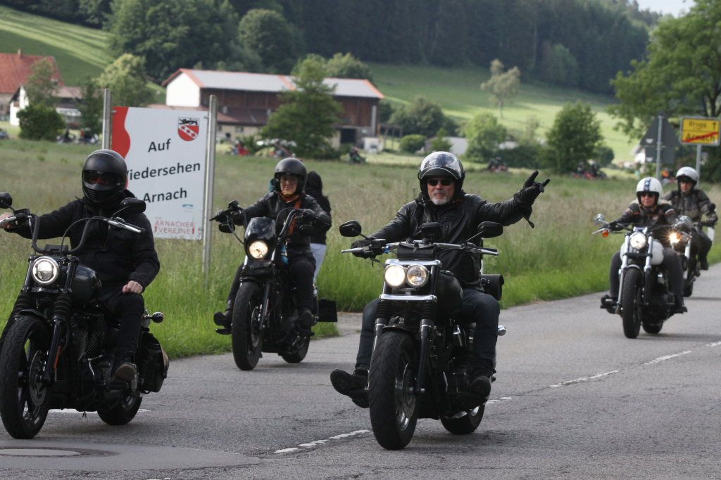 Der Samstag steht zunächst im Zeichen der berühmten Dorfrundfahrt, die wie immer um 18.00 Uhr gestartet wurde. Anders als im Vorjahr, als es eine halbe Stunde vor dem Start auf dem Festgelände noch sehr ruhig war, waren in diesem Jahr viele Biker schon früher mit ihren chromblitzenden Gefährten vor Ort. Zusammen mit den „Spätberufenen“ ergab sich dann ein wirklich beeindruckendes Defilee von zwei- und dreiräderigen Gefährten, die sich in Richtung Arnach-City in Bewegung setzten. Von den Edelmarken Harley Davidson, Triumph und Norton angefangen über zahlreiche japanische Modelle bis hin zum Moped Marke Eigenbau war auch in diesem Jahr wieder alles vertreten. Die zahlreichen Oldtimer, etwa ehemalige Militärmaschinen mit Beiwagen, NSU Quicklys und andere, aber auch viele Sondermodelle ließen das Herz der Zweiradfans höher schlagen. Auch zahlreiche Fahrzeuge mit drei Rädern wie die chromblitzenden Trikes, originelle Dreiräder und einige Quads, wie etwa das vom Snow-Mobil abgeleitete Arctic Cat, mischten sich unter Zweiradfahrer.