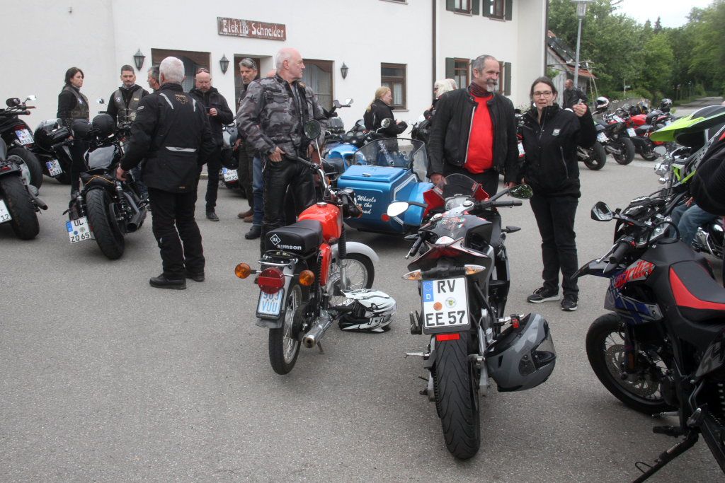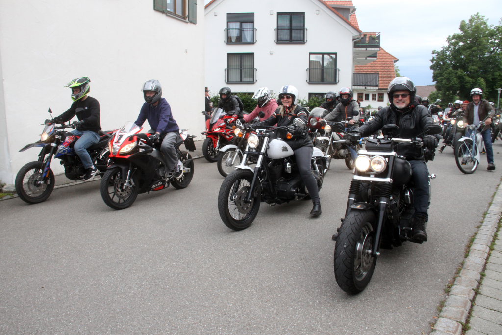 Eine (eher unfreiwillige) Neuerung gab es dann beim Boxenstop: Weil die Ratperoniusstraße zur Zeit generalsaniert wird, konnte dieser nicht wie all die Jahre zuvor beim Lagerhaus stattfinden, weil die Zufahrt dorthin gesperrt war. Der alternative Boxenstopp fand nun zwischen Finkhof-Lager und Elektro-Schneider am Kirchberg statt. Das obligatorische Schmalzbrot und der Traubenmost schmeckten dort beim plätschernden Brunnen genauso gut wie beim Lagerhaus. Beim Boxenstopp konnte man erkennen, dass auch an vielen Bikern – und auch Bikerinnen – die Zeit nicht spurlos vorbeigegangen ist: Einige sind mit der ganzen Familie unterwegs, andere wiederum sind zwischenzeitlich ins Lager der „Silberrücken-Fraktion“ gewechselt. Und wieder andere halten es wie manch braver Bauer in Oberschwaben, der sein Pferd nur noch wegen der Blutritte in Weingarten und Bad Wurzach im Stall stehen hat.