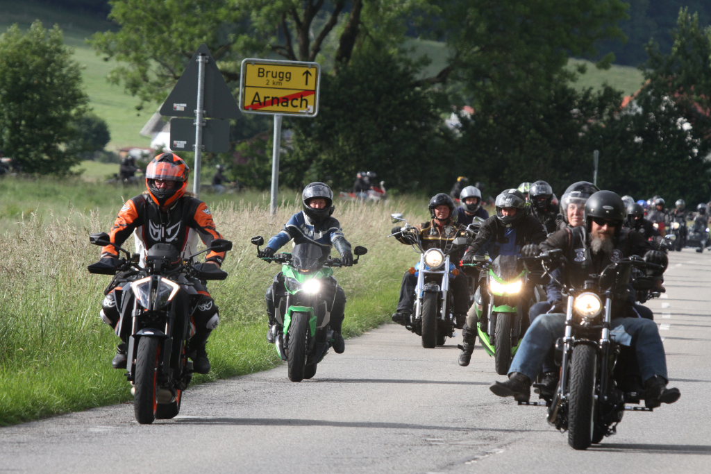 Arnach – Die Motorradfahrergemeinschaft – kurz MFG Arnach – richtete ihr 43. Motorradtreffen aus. Zu den Highlights gehört immer die gemütliche Biker-Hockete am Freitagabend, mit der alljährlich das traditionsreiche Bikerfest am idyllischen Tobelbach an der Straße zum Ziegelwerk Arnach eröffnet wird. Am Samstag ist immer Dorfrundfahrt, eher der Bikers-Rock das Gelände am Bach beben lässt.