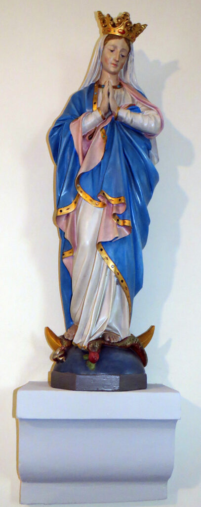 Die restaurierte Brugger Marienfigur. Sie steht auf einer Mondsichel und auf einer Schlange. Erläuterungen hierzu im Faltblatt unter “Downloads”. Foto: Gerhard Reischmann