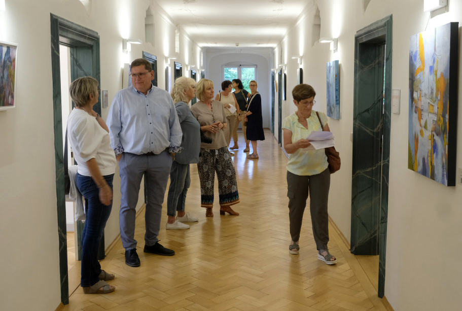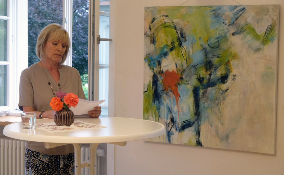 „Es bedeutet mir viel, meine Arbeiten mit Ihnen teilen zu können – denn Kunst lebt vom Austausch,“ erläuterte die Künstlerin den Grund für diese Ausstellung und die Vernissage. Da sie den Großteil ihres Lebens in Kanada verbracht hatte, sei es ihr wichtig, die Werke auch in der Sprache zu betiteln, in dessen Sprachraum sie entstanden sind. „Die ausgestellten Werke sind abstrakte Acryl-Mischtechnik-Arbeiten, in denen ich mich mit Themen wie Abschied, Wandel und Neubeginn auseinandersetze. Mit kräftigen Farben und dynamischen Pinselstrichen erzähle ich vom Leben in all seinen Höhen und Tiefen und versuche, das Unsagbare sichtbar und spürbar zu machen.“