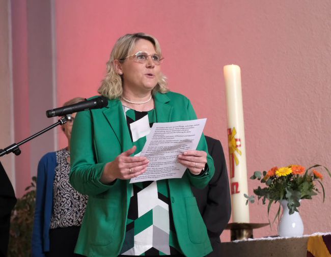 Für die Ansprache von Bürgermeisterin Alexandra Scherer wählte Kuczera die Farbe Grün. Die Bürgermeisterin fand es schön, dass die Seelsorge für die Gemeinde nun wieder auf zwei Schultern ruht, weil damit die beiden Pfarrerinnen auch Zeit für ihre Familien haben werden. Für die Gemeinde sei es auch von Vorteil, weil sie damit auch zwei Ansprechpartner habe. „Sie treffen hier auf eine sehr weltoffene Gemeinde“, ermutigte sie Cora Boettiger. Als Gastgeschenk übergab sie einen Gutschein für das Vitalium sowie den Wurzacher Willkommensgruß für neu zugezogene Bürger.