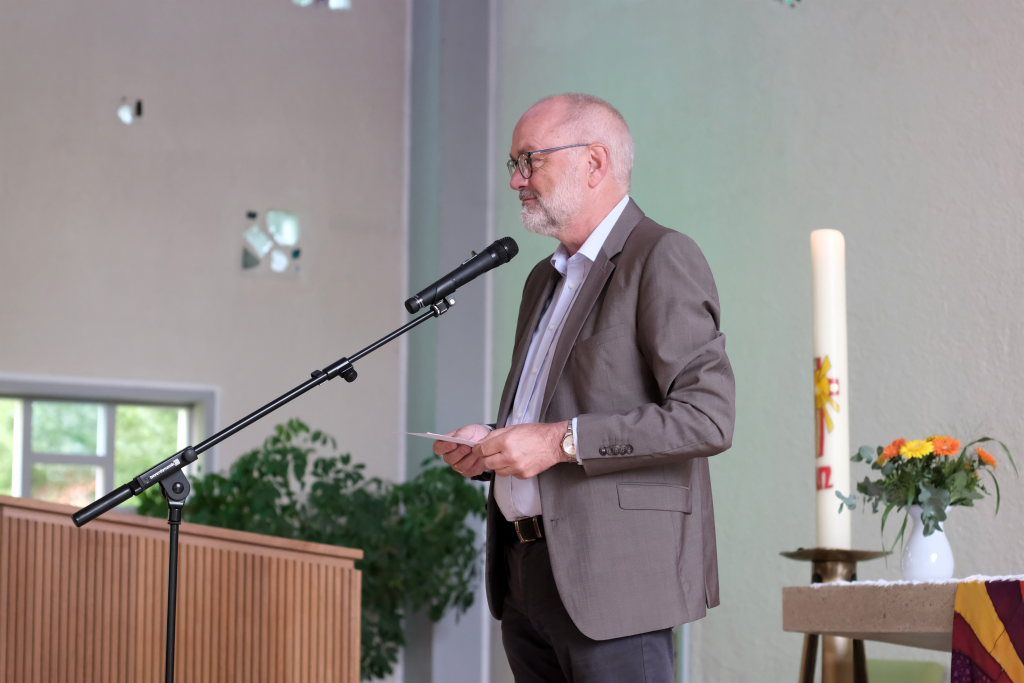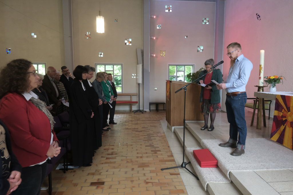 Nach dem Segen und dem Schlusslied des Posaunenchores, der den Gottesdienst musikalisch mitgestaltete, war Pfarrerin Silke Kuczera stolz, die neueste Errungenschaft der Kirchengemeinde zu präsentieren, die gut getimet für diesen Gottesdienst installiert worden war: LED-Lichter, deren Farbe gewechselt werden können. So konnte für jedes Grußwort der Altarraum in der „Hausfarbe“ des Sprechers angestrahlt werden.