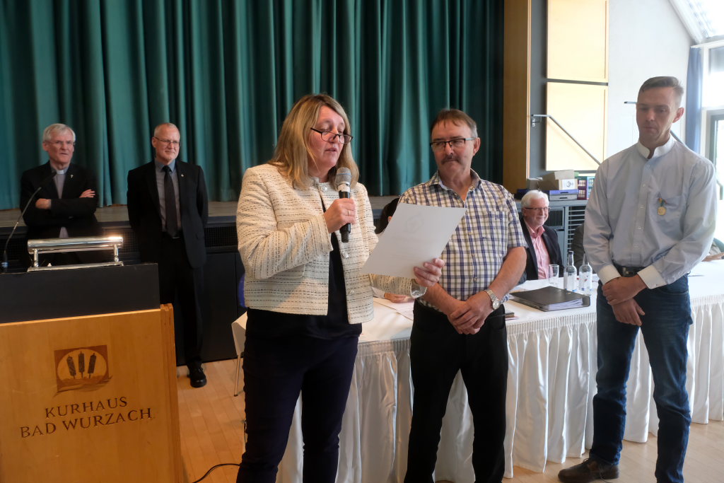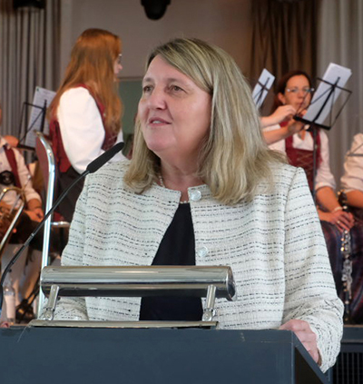 Bürgermeisterin Scherer (Bild) dankte den Blutreitern für ihre Bereitschaft, die für Bad Wurzach so wichtige Tradition zu pflegen – und aus dem Glauben heraus für ein menschliches Miteinander einzutreten. Sie bat die Gruppenführer darum, die Einladung an die Veteranen, die Prozession von der Tribüne beim Marienbrunnen aus zu verfolgen, weiterzugeben.