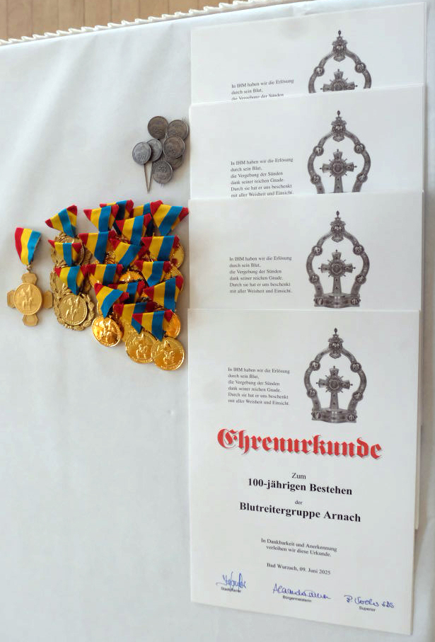 Vier Blutreitergruppen wurden besonders geehrt: Noch bevor der Wurzacher Blutritt offiziell 1928 erstmals durchgeführt wurde, wurde die Blutreitergruppe Arnach gegründet, die vor wenigen Wochen ihr 100-jähriges Bestehen feiern konnte (sie nahm damals am Weingärtler Blutritt teil). Seit 80 Jahren dabei sind die Blutreiter aus Reinstetten. Seit 75 Jahren dabei ist die Blutreitergruppe aus Altmannshofen und seit 50 Jahren die Gruppe aus Leupolz, bei der Pater Konrad immer mitreitet (er stammt von dort).