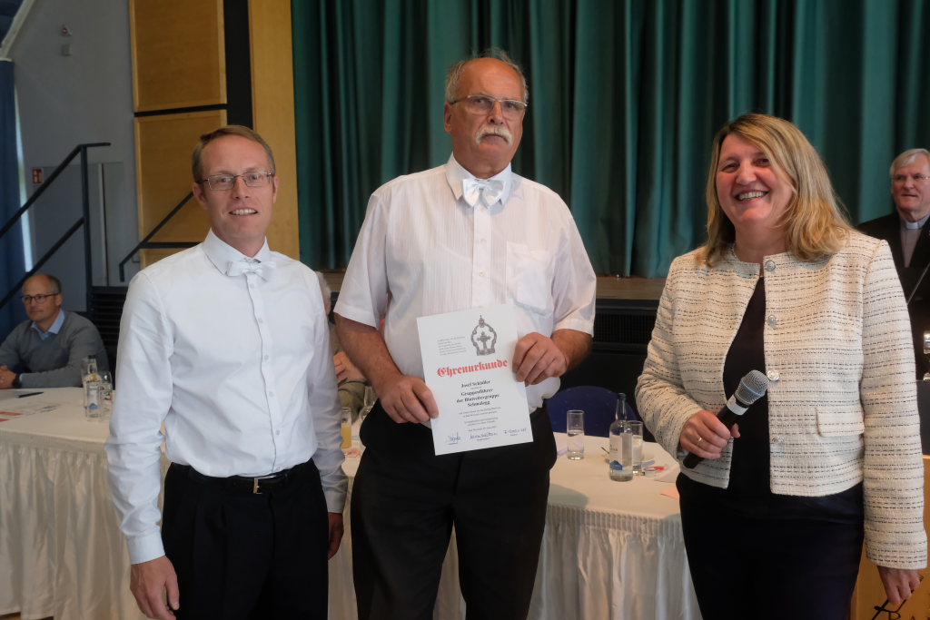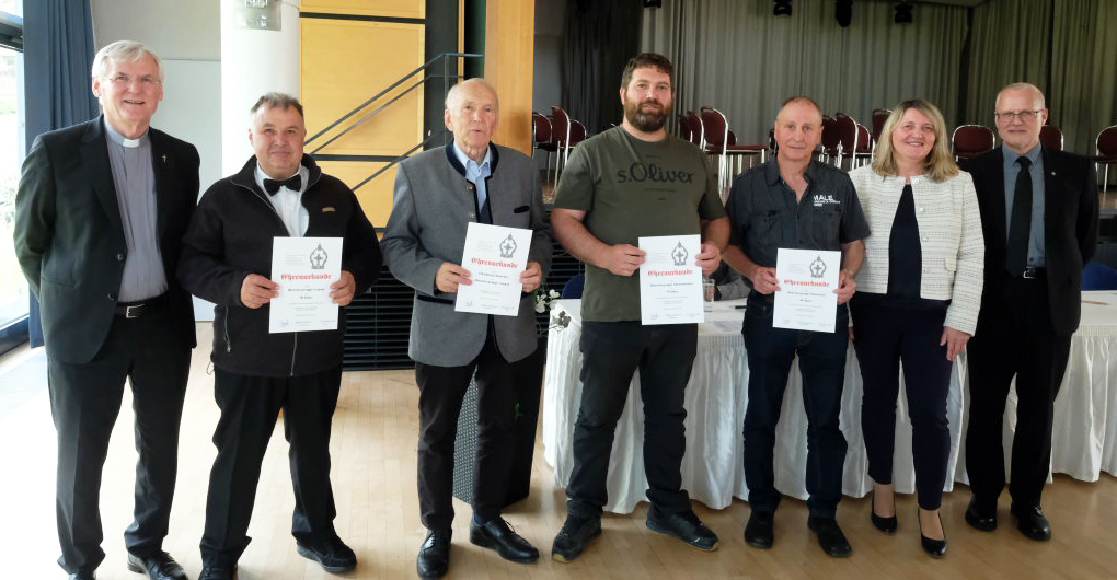 Vertreter geehrter Gruppen (mit Urkunden). Links Superior Pater Konrad Werder, rechts neben Bürgermeisterin Alexandra Scherer Stadtpfarrer Stefan Maier.