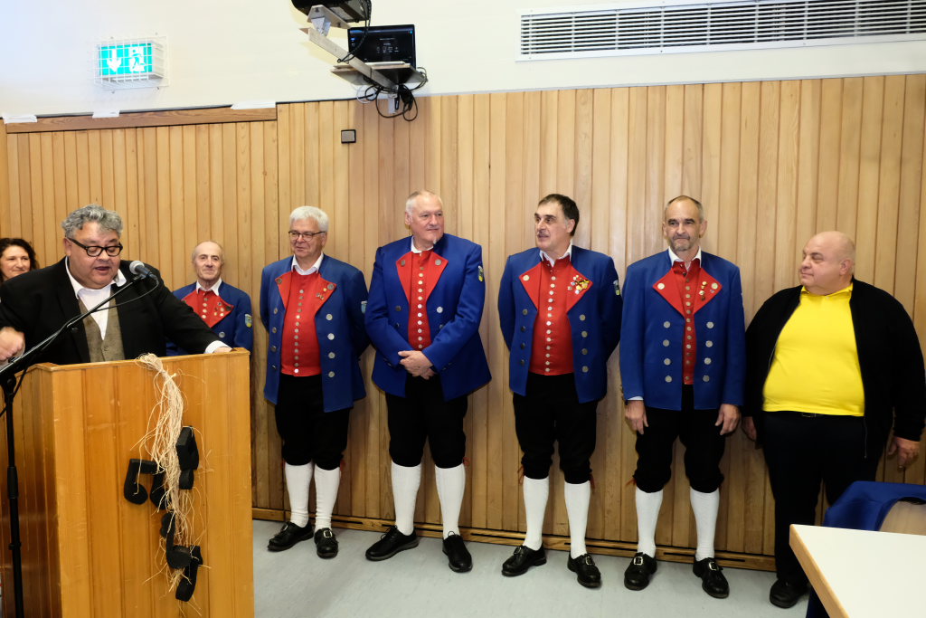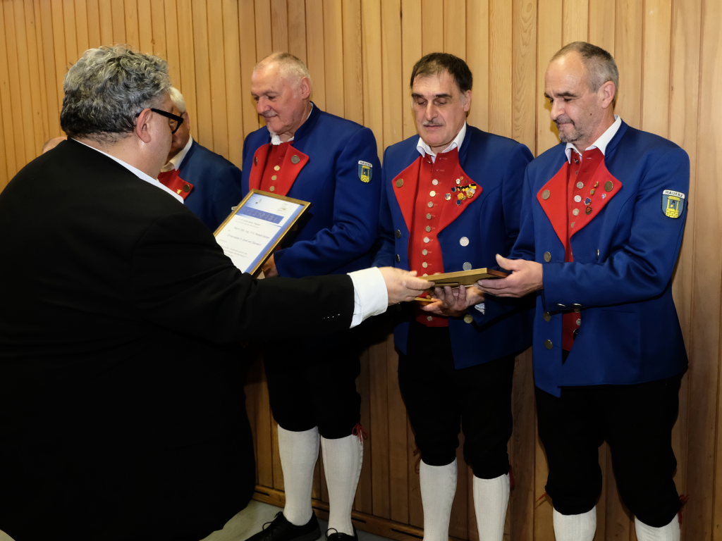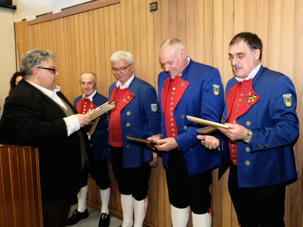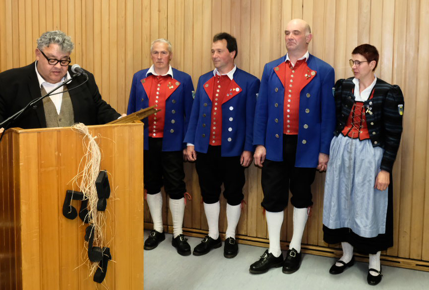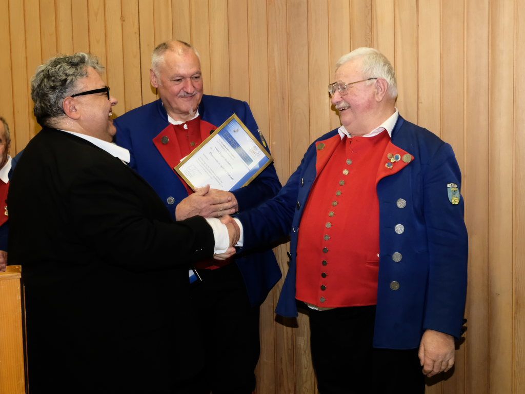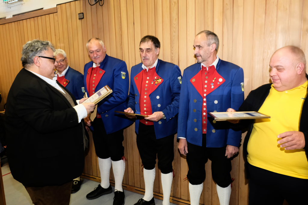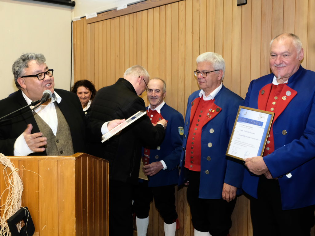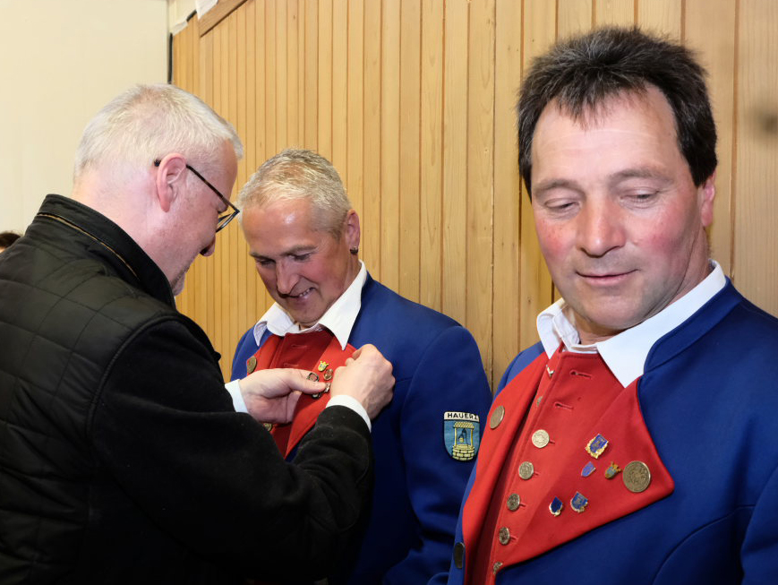 In gewohnt kurzweiliger Manier führte Rudi Hämmerle die Ehrungen der Hauerzer Musiker durch. Er konnte sich noch gut an das Kreismusikfest in Hauerz vor 15 Jahren erinnern, denn nach dem großen Regen damals sei seine Uniform plötzlich arg eng geworden. Einen Helfer hatte er sich für diesen Abend auch gleich rekrutiert: Pfarrer Stefan Maier, selbst Musiker bei der Stadtkapelle, durfte den Geehrten die Ehrennadeln ans Revers heften.