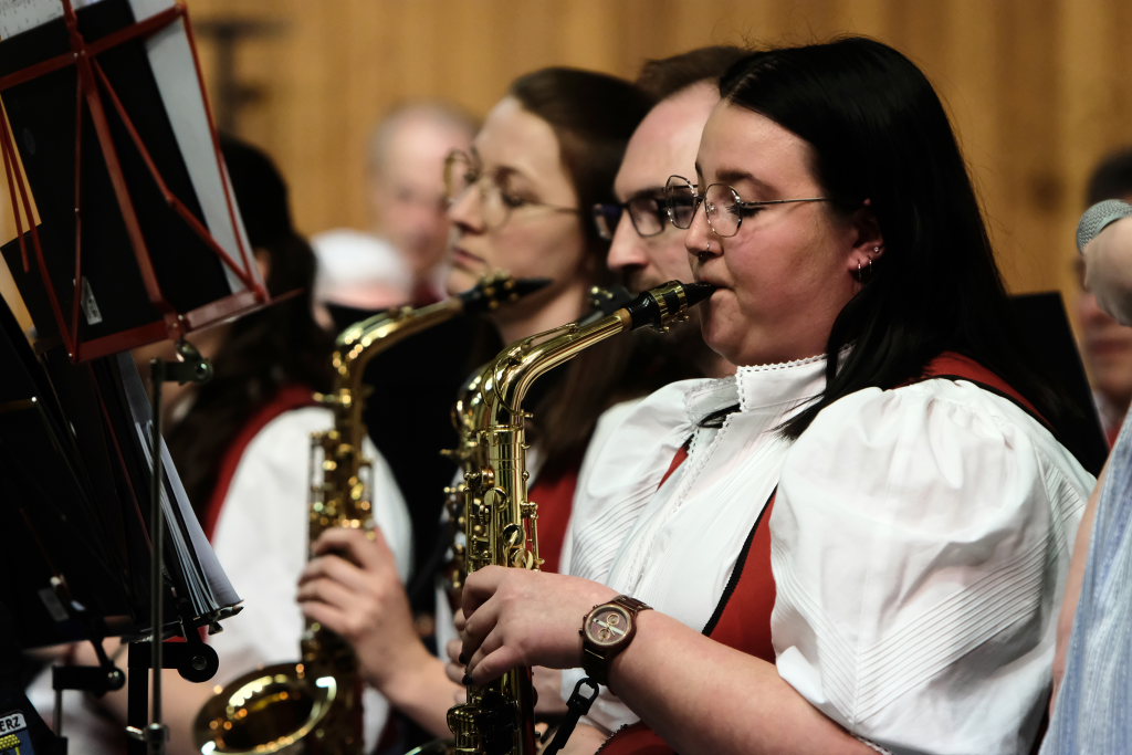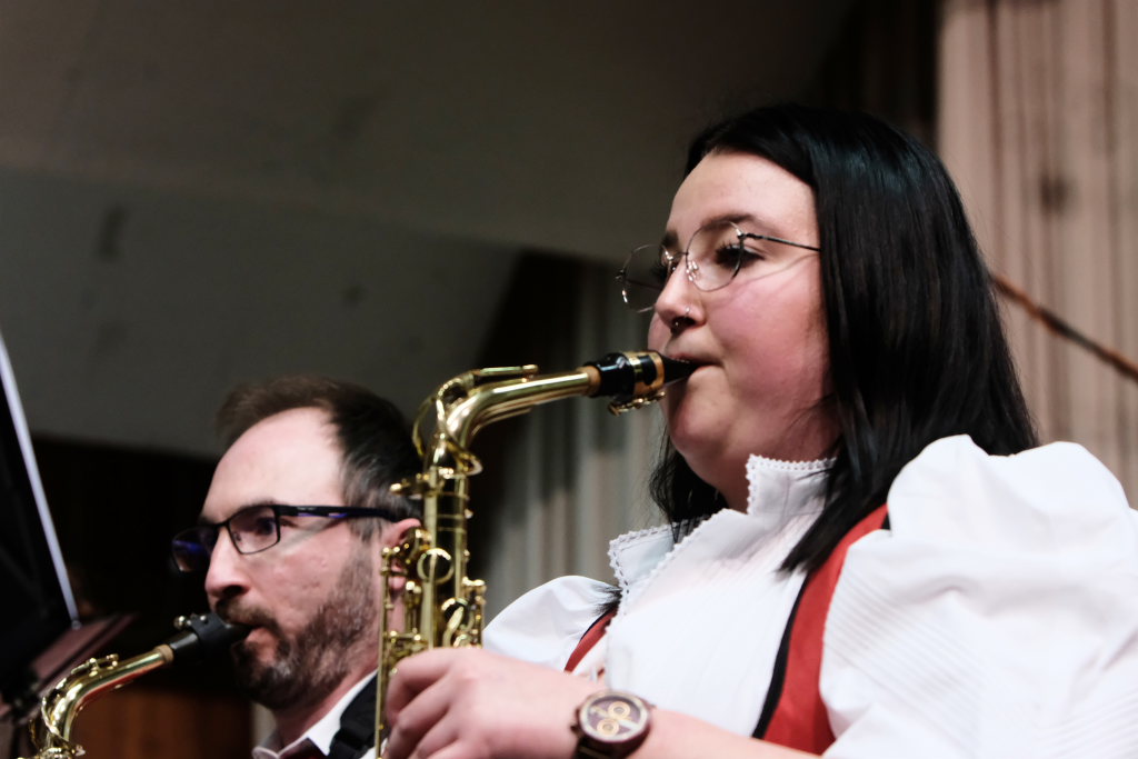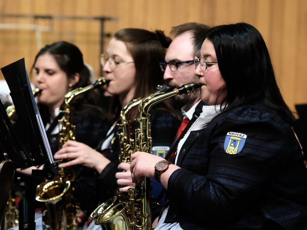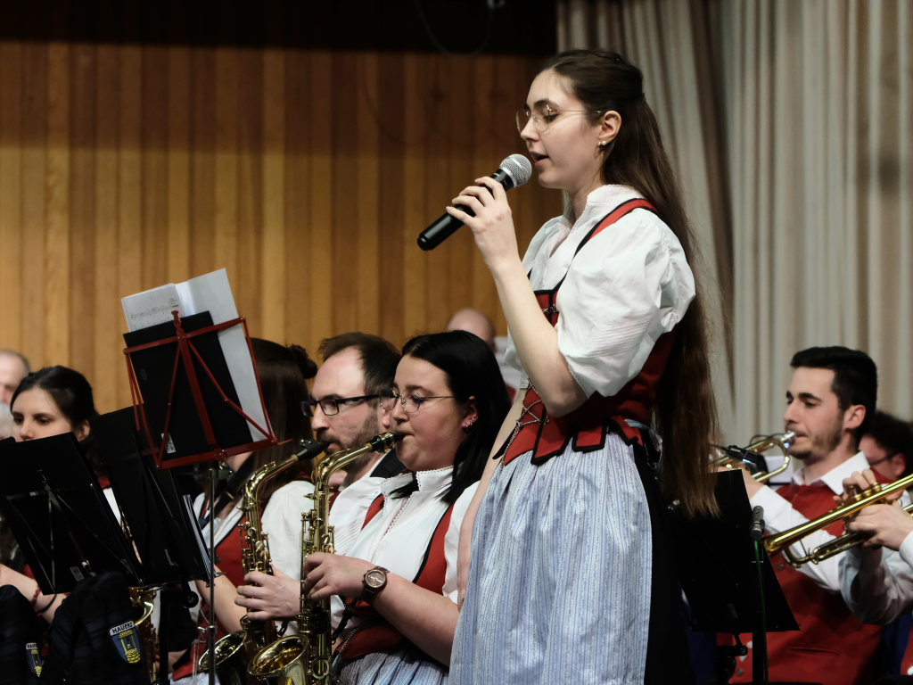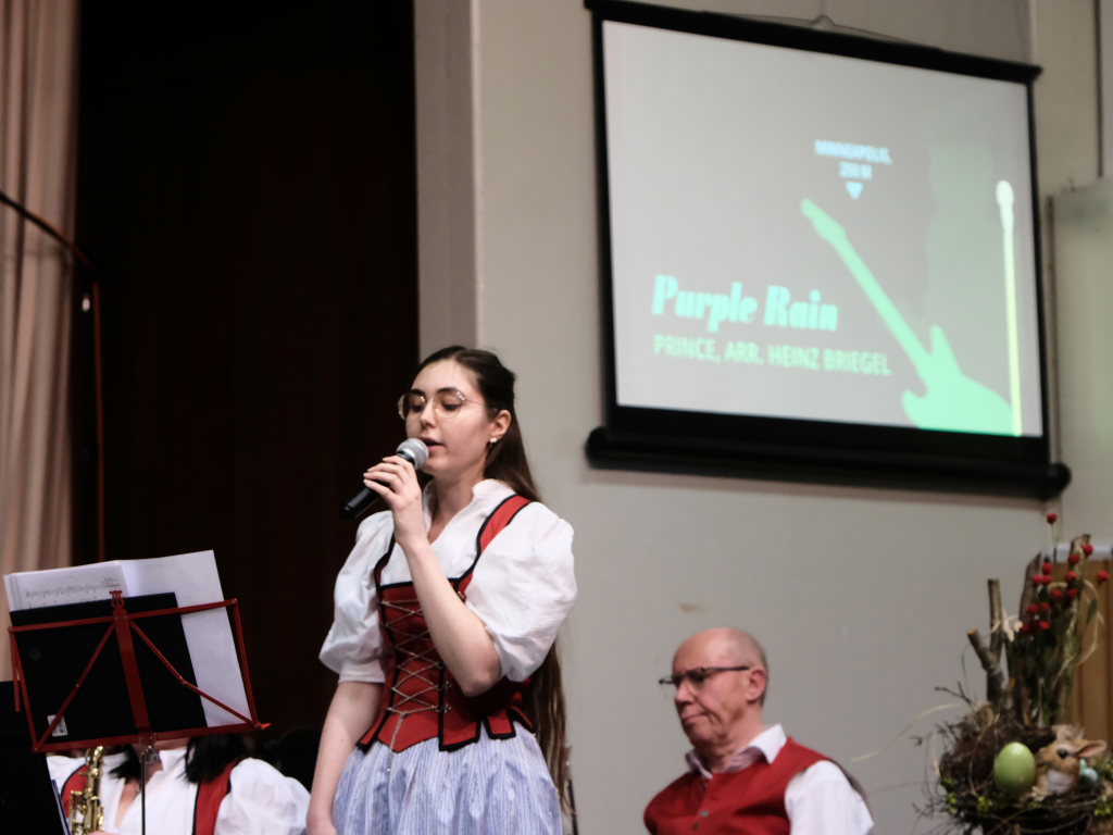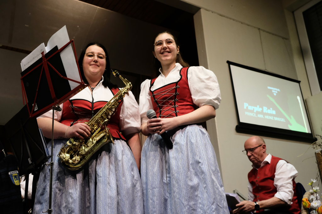Nach den Ehrungen setzte der Musikverein Hauerz sein Konzert mit dem bekannten Popsong „Purple Rain” von Prince im Arrangement von Philipp Sparke fort. Mit ihrem Saxophonsolo konnte sich Elea Engelsberger als Solistin auszeichnen, während Simone Ritscher hierbei zum Gesangsmikrophon griff und auch sie konnte diese Aufgabe mit Bravour meistern.