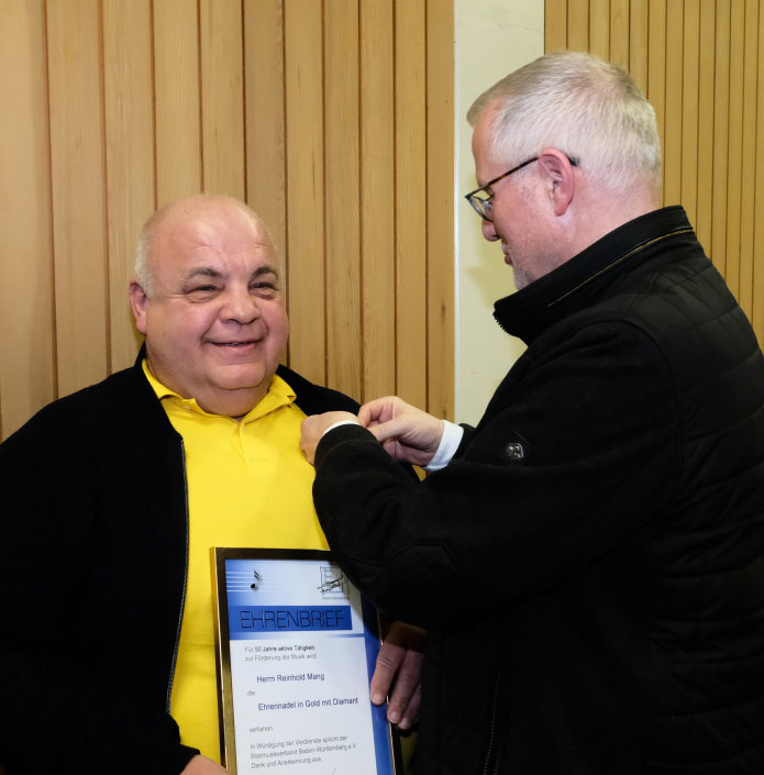 Gar für 50 Jahre wurden von Hämmerle und Maier mit der Ehrennadel in Gold mit Diamant und Ehrenbrief ausgezeichnet: Eugen Buckenheu, Rudolf Herberger, Reinhold Mang, Robert Müller, Herbert Rodi und Roland Schuppan.