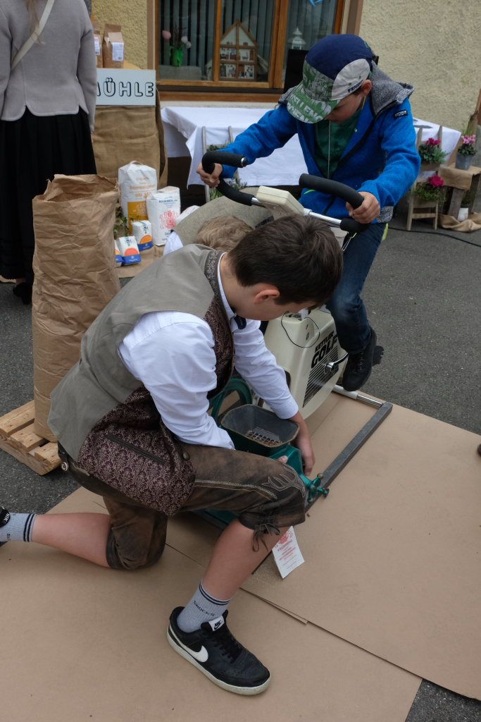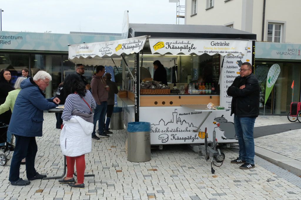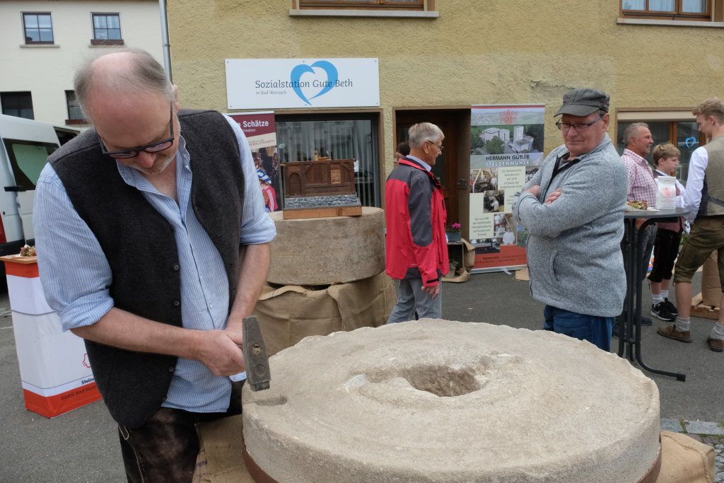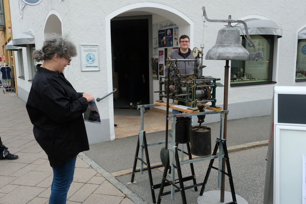Nebenan in der Stadtbücherei konnten sich Kinder an einer märchenhaften Geschichte freuen, während die Erwachsenen nach Lust und Laune im Bücherflohmarkt stöbern konnten. Einige Schritte stadteinwärts konnte man, nachdem man die Autoausstellung eines Wurzacher Autohaus passiert hatte, beim Eingang zur Bürgerstraße beim “Uhrenflüsterer” Westermayer, dessen Vorfahr vor 135 Jahren das Geschäft gegründet hatte, das ehemalige Uhr- und Schlagwerk der Grundschule bewundern. Das bildete gemeinsam mit dem gegenüberliegen Stand der Druckerei Rothenhäusler, die Einblicke in Historie des Druckens zeigte, den Eingang zum historischen Handwerkermarkt, bei dem ein Büchsenmacher sein Handwerk präsentierte, Schornsteinfeger kleine Glücksbringer verschenkten, ein Schreiner die Präzision seines Handwerkes aufzeigte. Am Stelzenmühlemühle-Stand konnte jeder mittels eines Hometrainer-Fahrrades sein Mehl auf historische Art selbst mahlen.