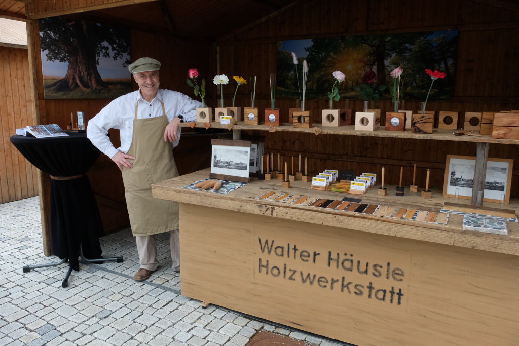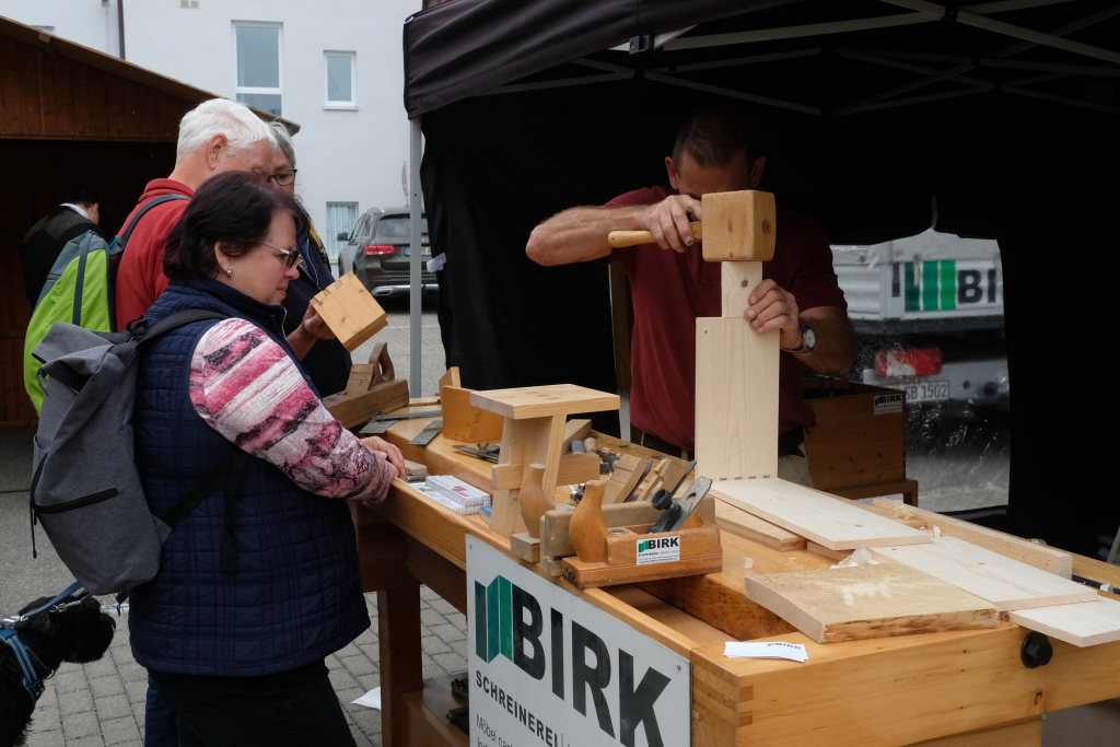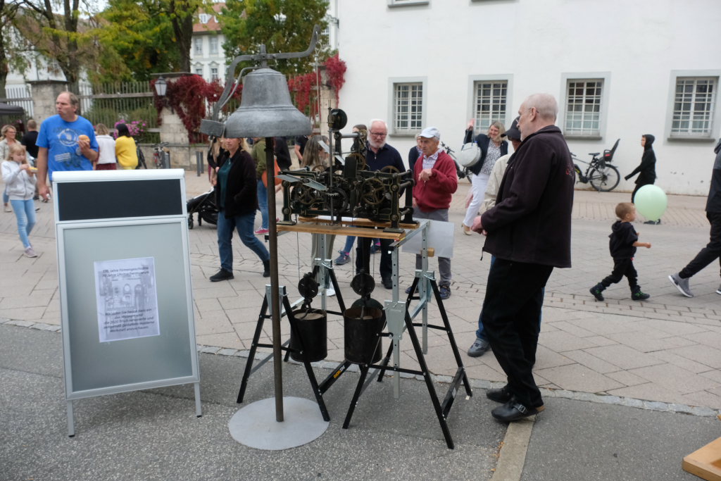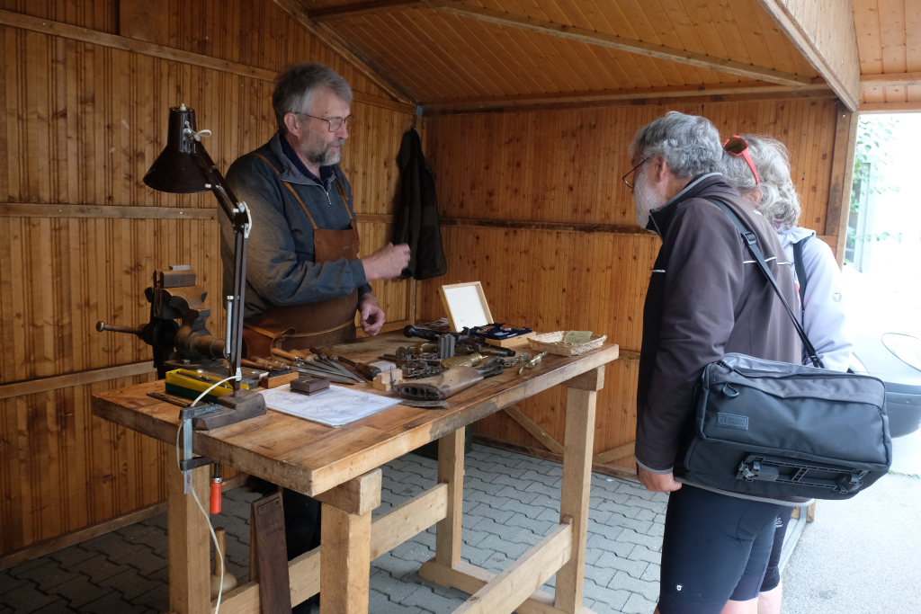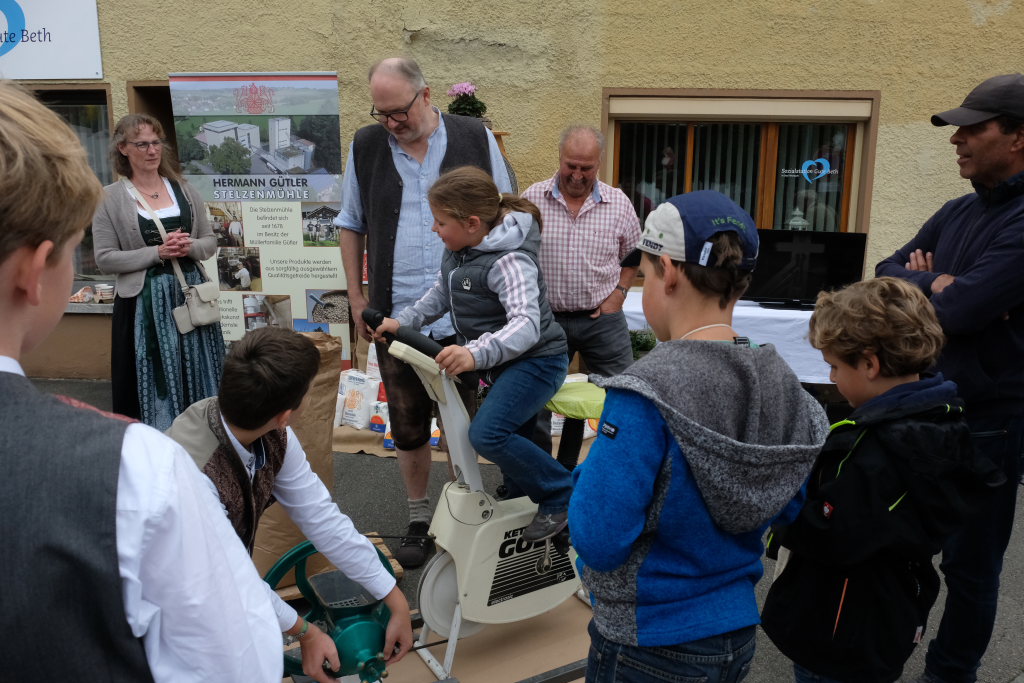 Nebenan in der Stadtbücherei konnten sich Kinder an einer märchenhaften Geschichte freuen, während die Erwachsenen nach Lust und Laune im Bücherflohmarkt stöbern konnten. Einige Schritte stadteinwärts konnte man, nachdem man die Autoausstellung eines Wurzacher Autohaus passiert hatte, beim Eingang zur Bürgerstraße beim “Uhrenflüsterer” Westermayer, dessen Vorfahr vor 135 Jahren das Geschäft gegründet hatte, das ehemalige Uhr- und Schlagwerk der Grundschule bewundern. Das bildete gemeinsam mit dem gegenüberliegen Stand der Druckerei Rothenhäusler, die Einblicke in Historie des Druckens zeigte, den Eingang zum historischen Handwerkermarkt, bei dem ein Büchsenmacher sein Handwerk präsentierte, Schornsteinfeger kleine Glücksbringer verschenkten, ein Schreiner die Präzision seines Handwerkes aufzeigte. Am Stelzenmühlemühle-Stand konnte jeder mittels eines Hometrainer-Fahrrades sein Mehl auf historische Art selbst mahlen.
