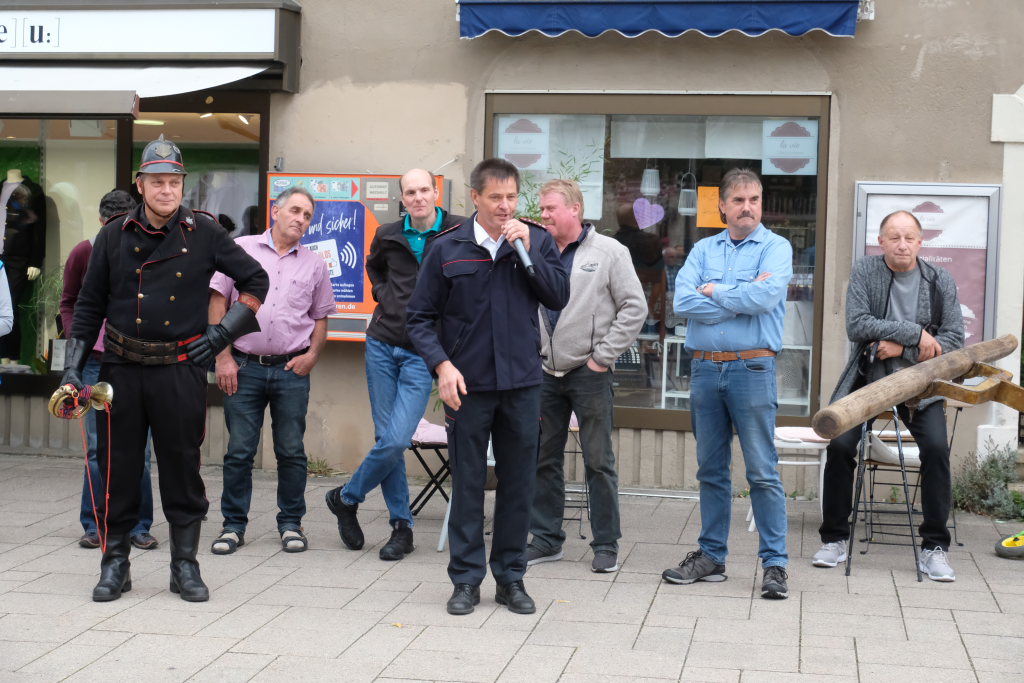 Vorbei an zahlreichen Flohmarktständen führte der Weg über den Viehmarkt und die Schlossstraße wieder auf Bad Wurzachs Hauptverkehrsachse, die Marktstraße und den Platz beim Marienbrunnen, wo die Feuerwehr aus Dietmanns mit ihrer historischen, mit Muskelkraft betriebenen rund 150 Jahre alten Feuerwehrpumpe gleich zweimal das Rathausdach „säuberten“.