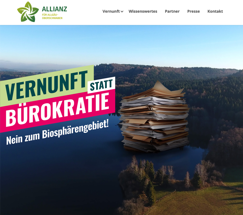 Solche Plakate hat die Allianz Allgäu-Oberschwaben vielfach in der freien Landschaft aufgestellt. Der Screenshot von der Webseite der Allianz Allgäu-Oberschwaben wurde am 16.10.25 gemacht.