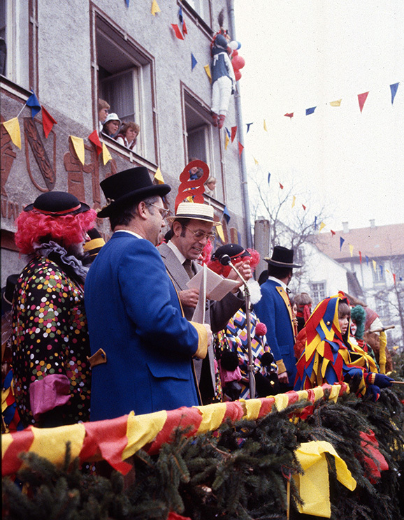 Die Bildschirmzeitung „Der Wurzacher“ hat sich für die Erhaltung des Bilderfrieses an den Außenwänden eingesetzt. Wir verweisen auf unseren Artikel vom 24. Januar 2023, zu finden unter nachstehendem Link. Der Fries war einst rot gefasst, wie man an dem Bild von einer Fasnet in den 1980er-Jahren erkennen kann. Zu sehen ist Bürgermeister Helmuth Morczinietz, dem vom Zunftmeister Karl Fimpel (Kafi) der Strohhut aufgesetzt worden ist.