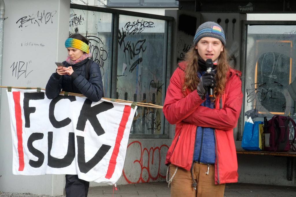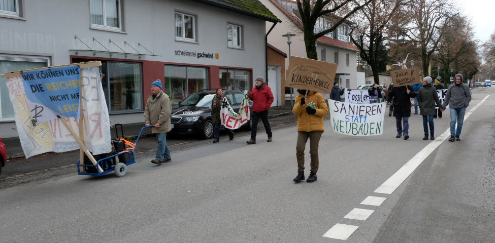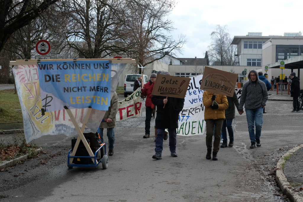 Am Postplatz erläuterte Lukas Häfele zunächst, wie er zu dem Titel „Hitzefrei “ jetzt mitten im Dezember gekommen war: „Wir haben viele heiße Rekordsommer nacheinander gehabt und es werden noch viele folgen“, sagte er vorab. Unsere Gesellschaft sei auf Wirtschaftswachstum „gepolt“, „aber die Ressourcen dieser Erde sind endlich.“ Das Mehr-höher-weiter-Prinzip habe vielleicht die letzten 50 Jahre funktioniert, „aber es geht nicht an, dass man auch jetzt noch immer größere Autos und Wohnungen kauft.“ Und nahm damit Bezug auf ein mitgeführtes Transparent: „Wir können uns die Reichen nicht mehr leisten!“