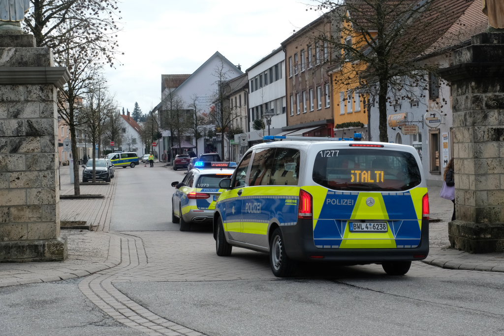Als der Demonstrationszug sich mit Verspätung vom Sammelplatz beim Schulzentrum in Bewegung setzte, dürfte Lukas Häfele schon etwas ernüchtert gewesen sein: Kaum jemand war seinem Aufruf gefolgt, insbesondere die Schülerschaft von allen Schulen blieb der Demonstration fern. Dafür war das Aufgebot der Polizei umso beeindruckender: 15 Polizisten mit sechs Fahrzeugen begleiteten die Demonstranten „auf ihrem Zug durch die Gemeinde“, anfangs quasi jeweils ein Gesetzeshüter als Begleitschutz für jeden Demonstranten.